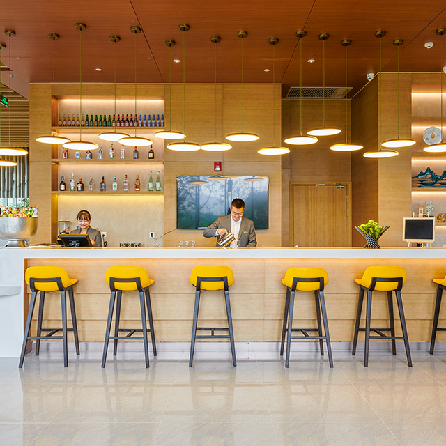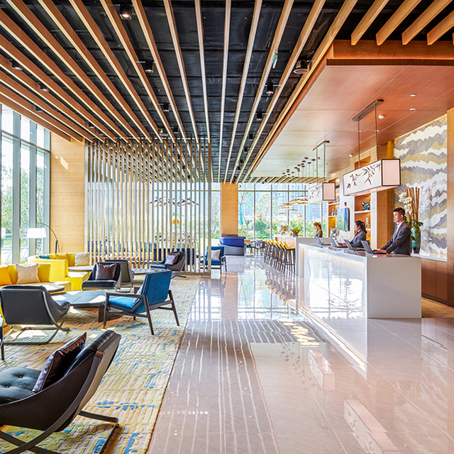 和传统酒店大堂不同,德清凯悦嘉轩酒店现代时尚设计的“大话廊”,不仅承担了check in/out 的功能,还衔接大话廊餐厅及咖啡吧区域(大话廊餐厅廊酒吧)。