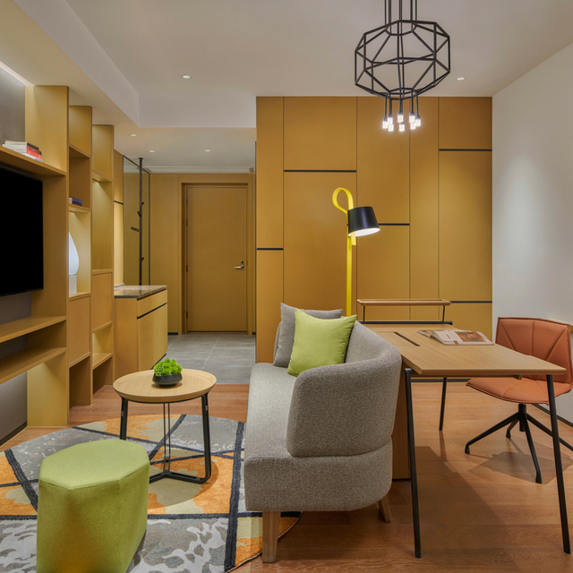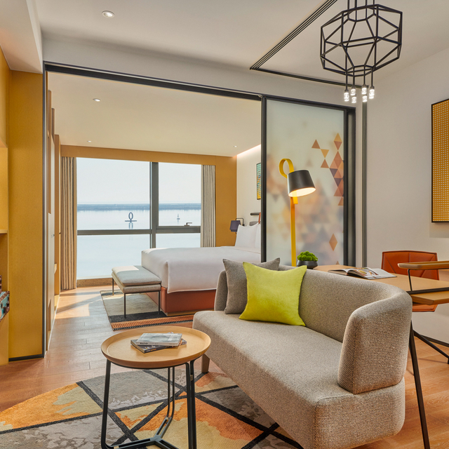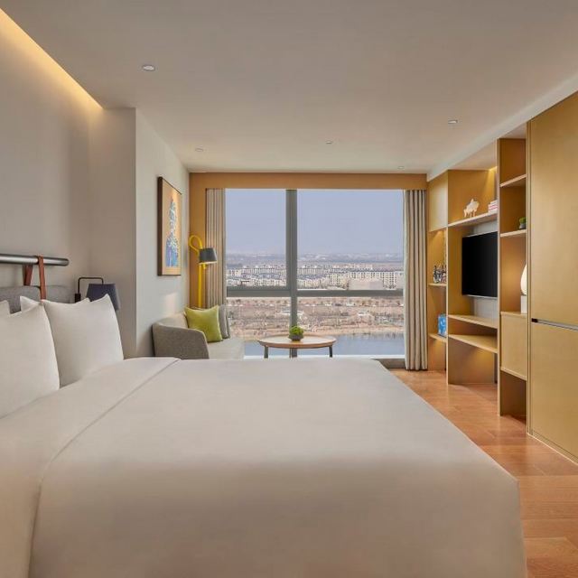 酒店拥有悦居房、豪华房、湖景房等房型300余间。其中悦居豪华大床房40㎡起跳宽敞明亮,自带客厅,俨然一个小套间!摩登雅黄点缀嫩绿、橙红,搭配富有设计感的灯具、装饰、画作...尽显时尚潮味!