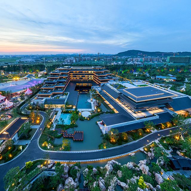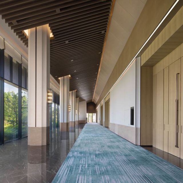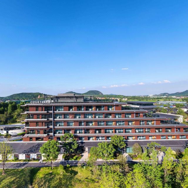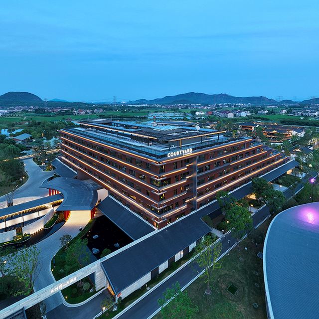 作为万怡品牌的度假标杆力作,酒店建筑设计由GAD负责,室内设计由CCD操刀。外观建筑巧妙融合江南民居美学与现代设计语言,以黑白灰为主色调,“U型围合”,层层退台式的山居造型、水平与垂直交织的立体园林布局,重现水墨江南的写意神韵。