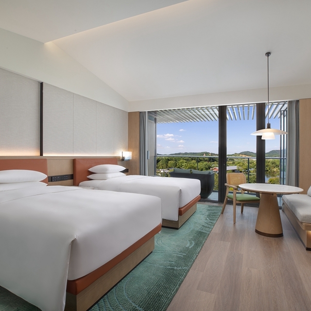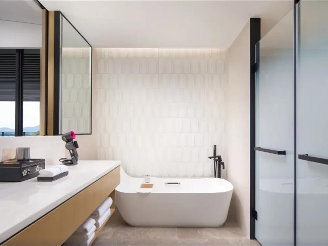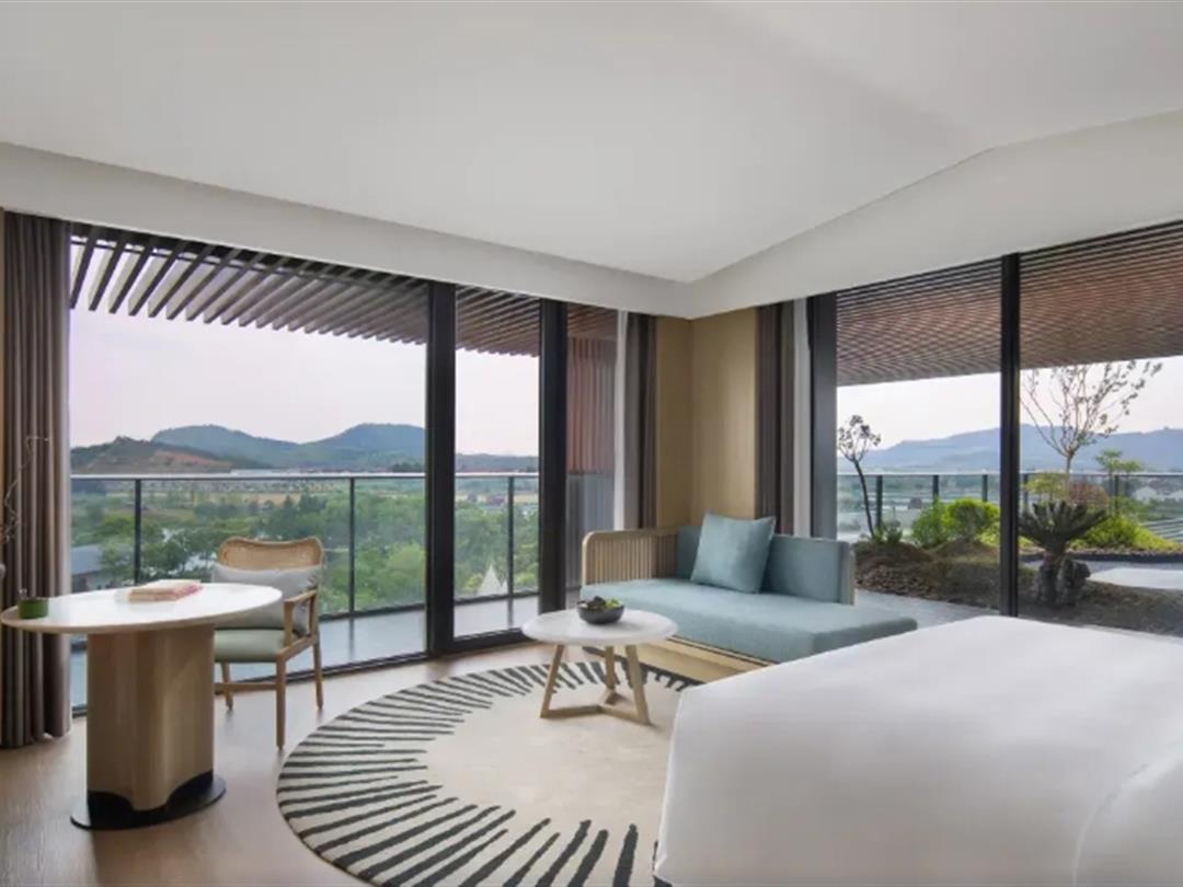 酒店拥有205间现代舒适的客房和套房,42㎡起的宽敞空间,让居停动线更流畅。落地窗模糊室内外界限,推门而出,便是自带的开放式观景阳台,视野开阔,在木质藤椅闲坐、发呆,或俯瞰舜山怡人风光,或赏园林景观,沉浸于慵懒度假氛围。