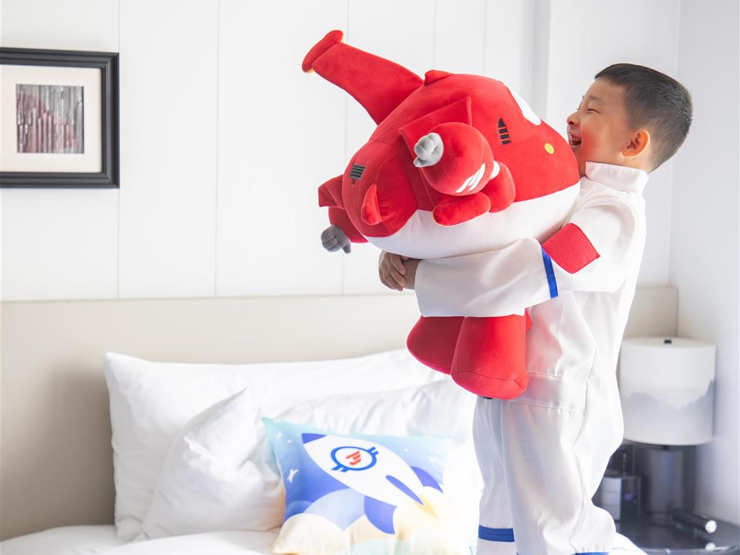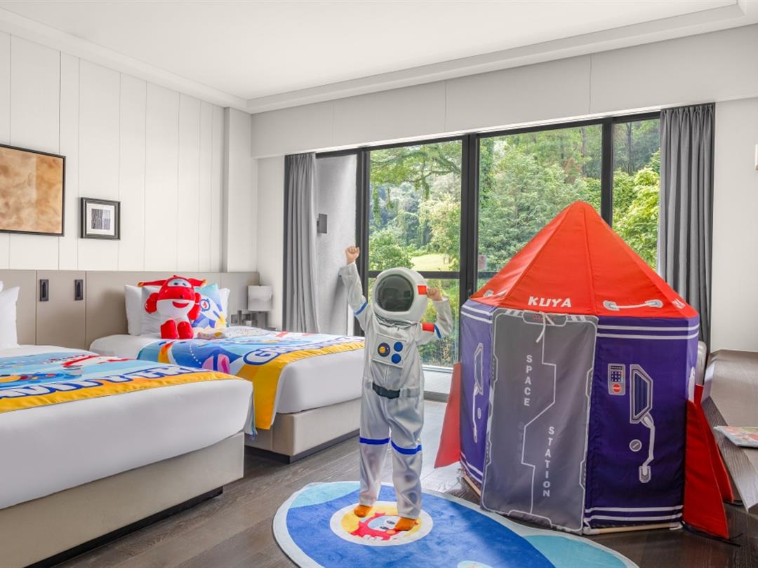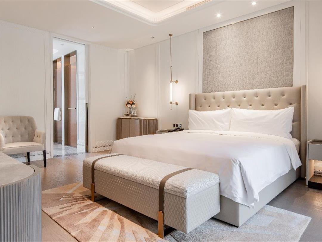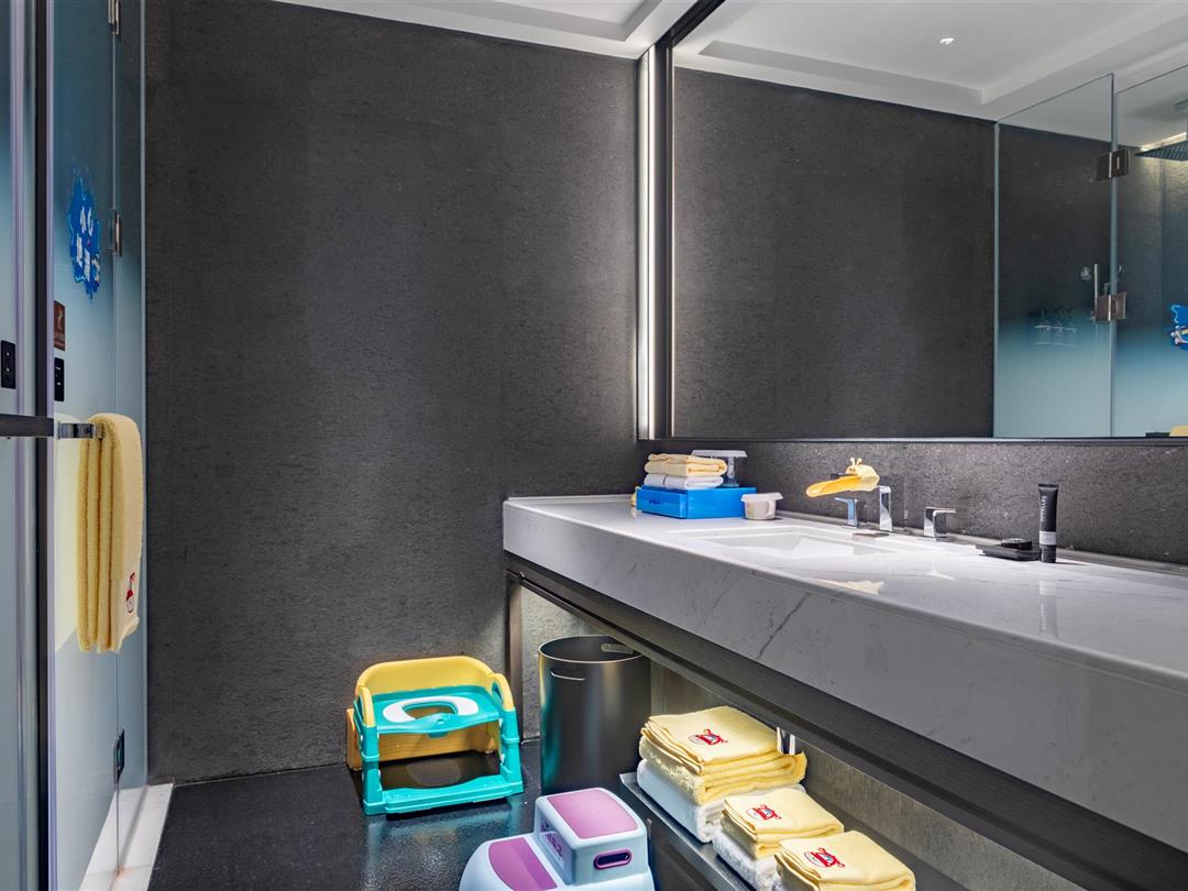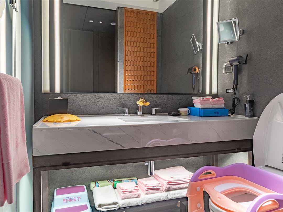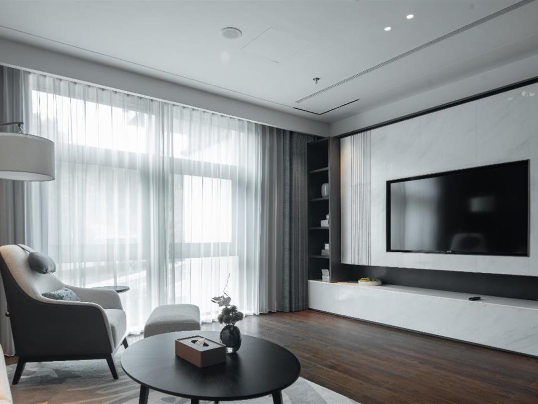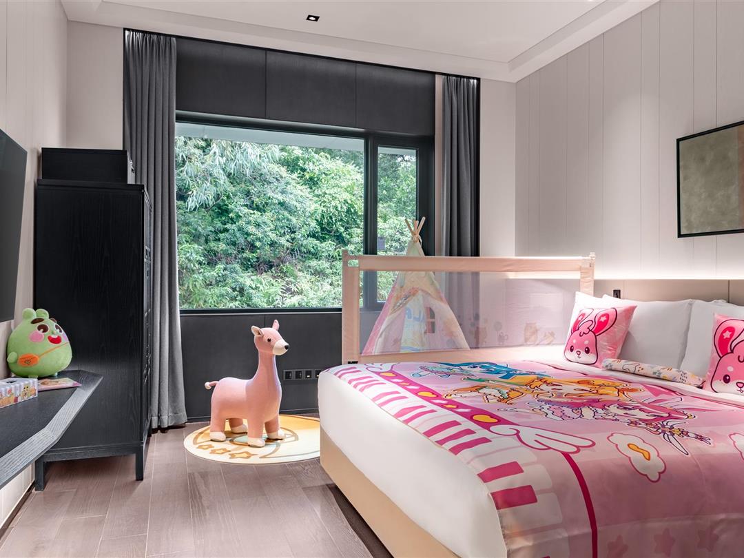 客房雅俗兼蓄,自然天成。空间设计运用黑白水墨相念,使得空间舍形而悦影,含质而趋灵,象征着包容、交流和融合,力求展现五岭之南历史与艺术脉络。源于岭南花窗演变的纹样打造的迷你吧柜门,打开即是功能齐全的迷你吧供客人使用
