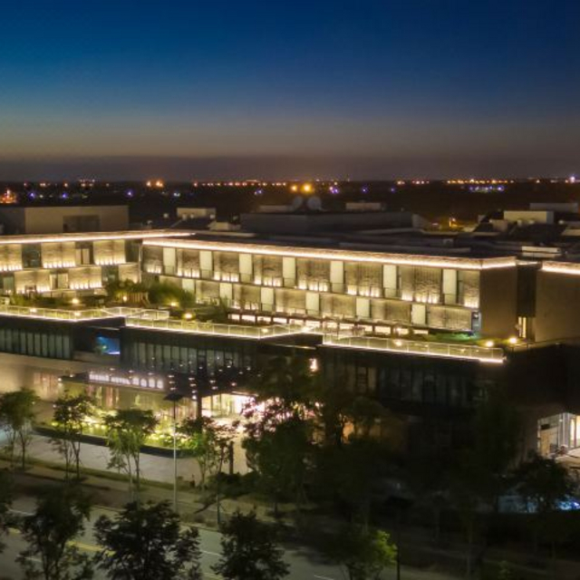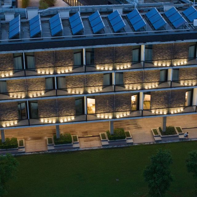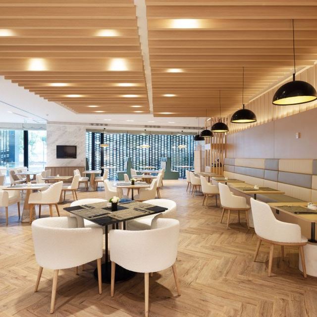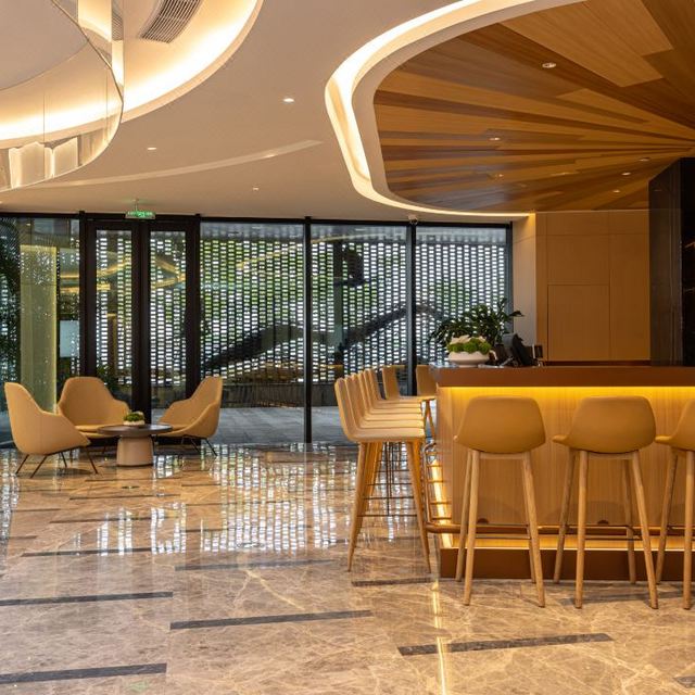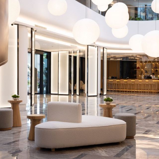 内部设计简约,蕴含精致细节,大堂开阔且布局流畅,木质元素与点缀其间的盆栽,共同营造出一种贴近自然的氛围,让人置身其中不禁感到轻松惬意。错落有致的吊灯为整个空间增加了丰富的层次感,而玻璃屋顶则巧妙引入自然光线,白日里通透明亮,光影在地面“作画”。