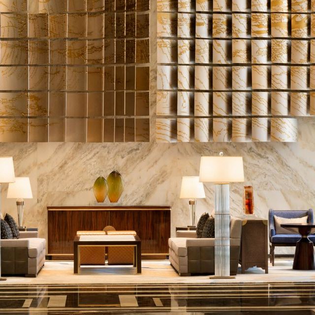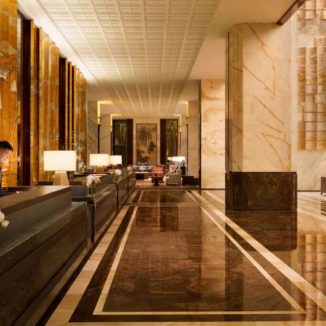 酒店大堂的设计让人觉得眼前一亮,特别是接待台后方的巨幅漆画屏风《江山祈福图》、位于大堂右方的艺术品《远航》,充满特色,富丽堂皇中透露着典雅。