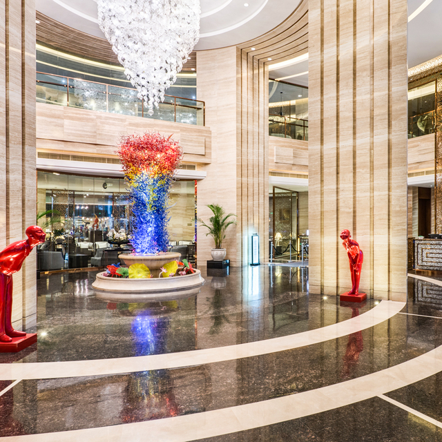 步入大堂,明亮通透、高大开阔,原木色与褐色为主调,颇为清雅。内有一座名为“生命之树”的琉璃雕塑,与正上方的水晶灯搭配,尽显气派与典雅。