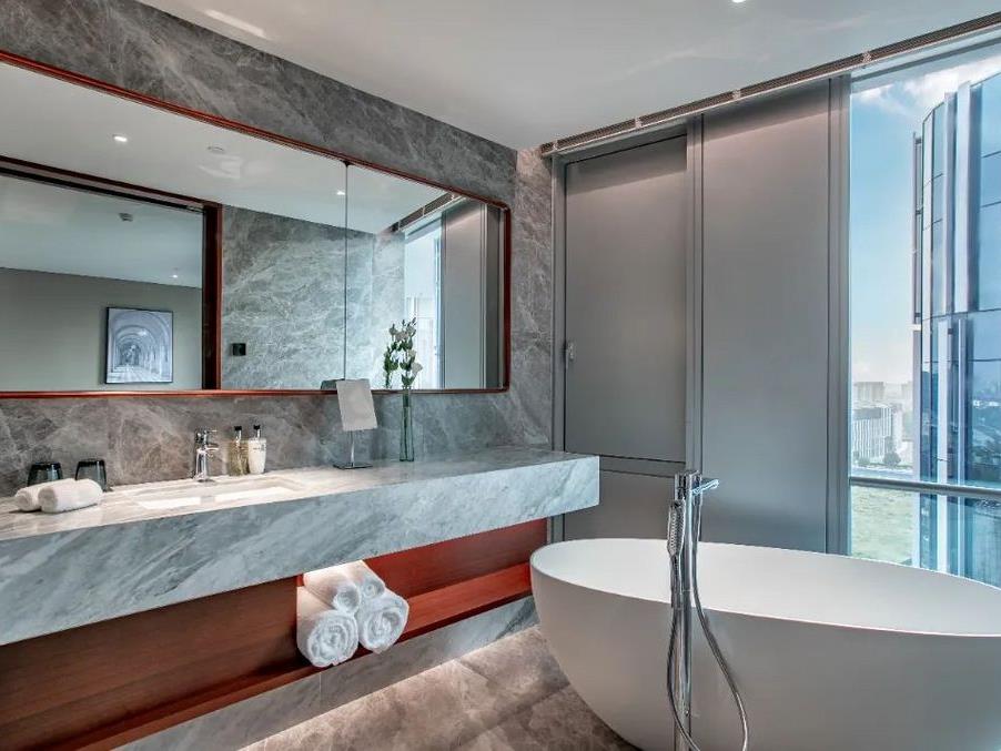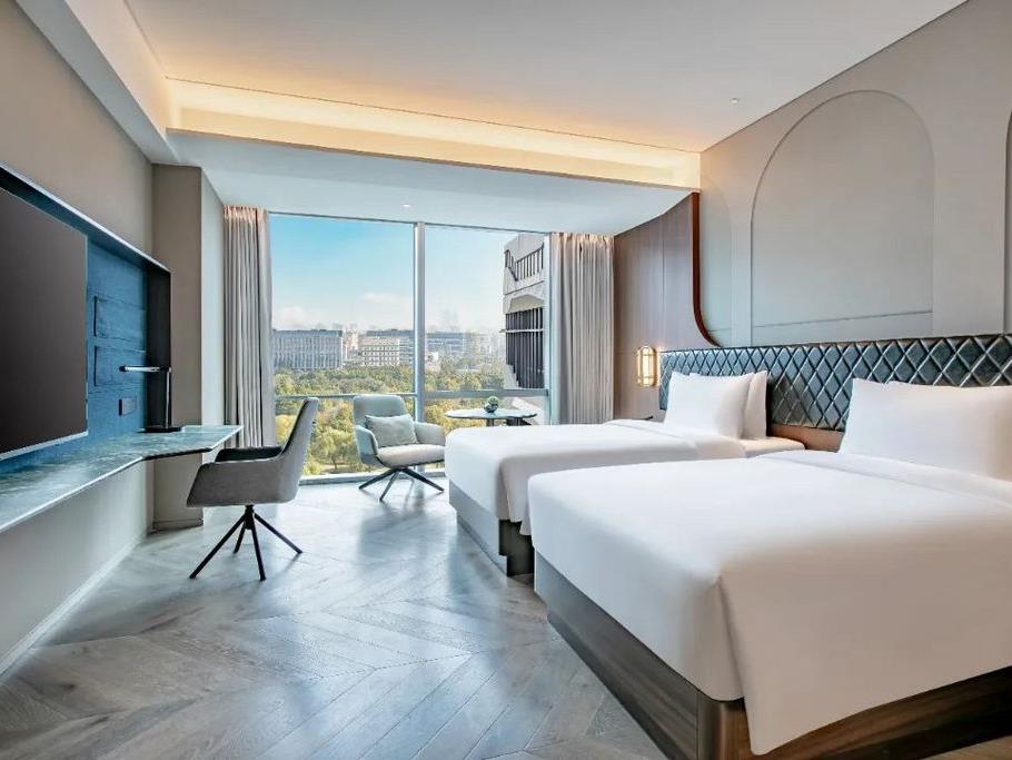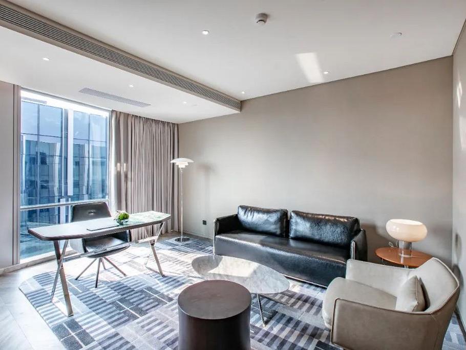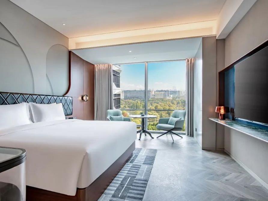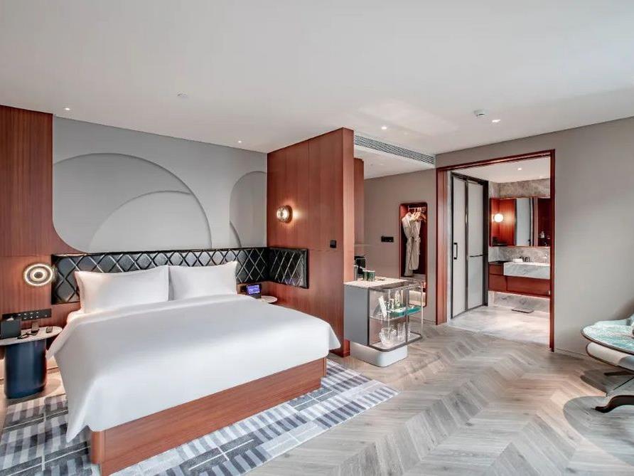 酒店总共拥有218间客房及套房。简约而不失设计感的客房,配备一键投屏、智能唤醒、及机器人管家等智能服务。