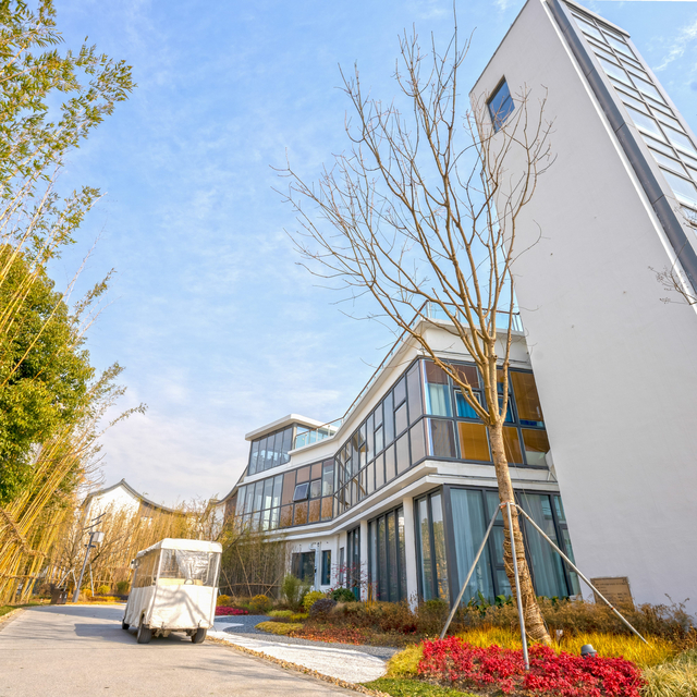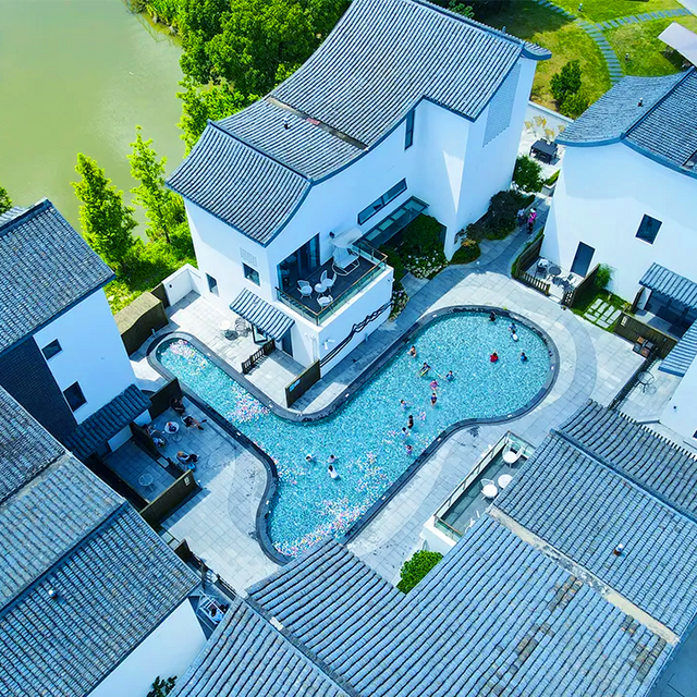 酒店设计风格为江南古朴的建筑形态为主,院中是精心种植的绿植花木,院外是农田、果园、荷塘,处处都透着江南水乡温婉秀气的美。