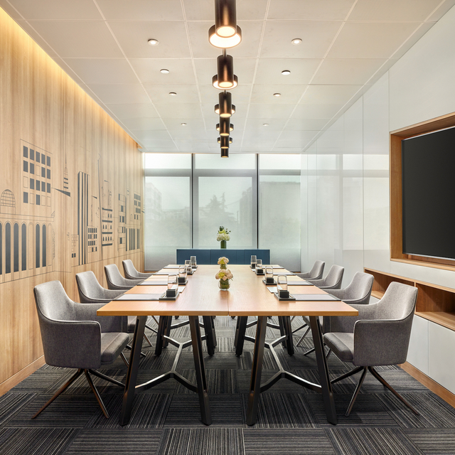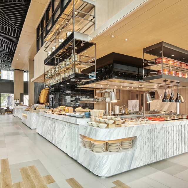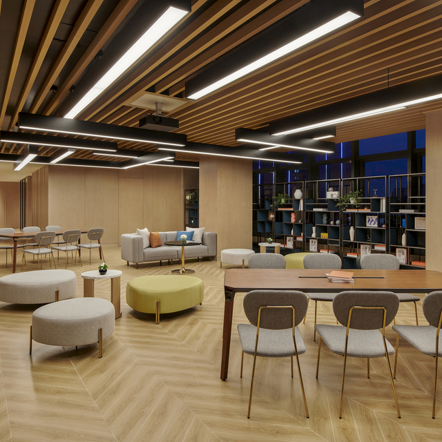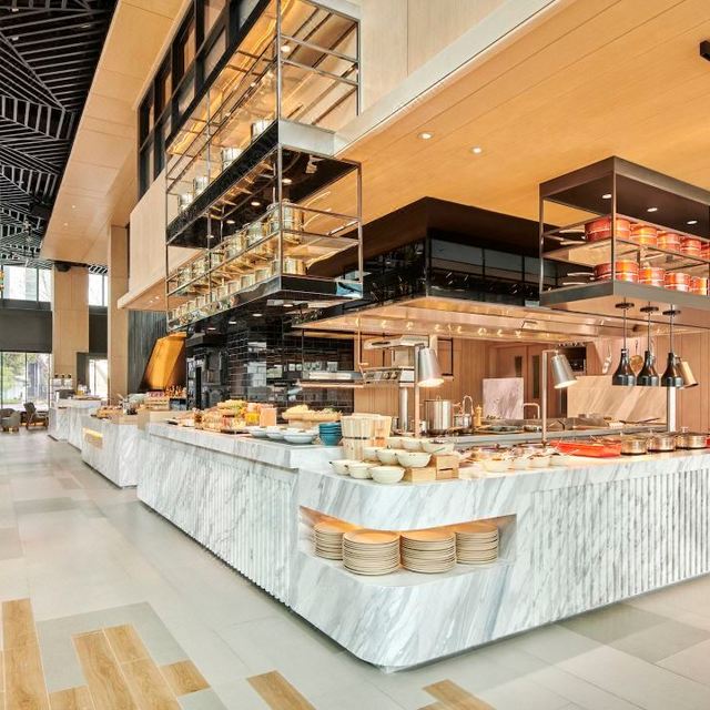 同样位于一楼的思方汇咖啡(Townsquare Café),为半开放式设计,分室内和室外区域。绿植郁郁葱葱,高低不同、材质各异的沙发区域,可按个人喜好选择。