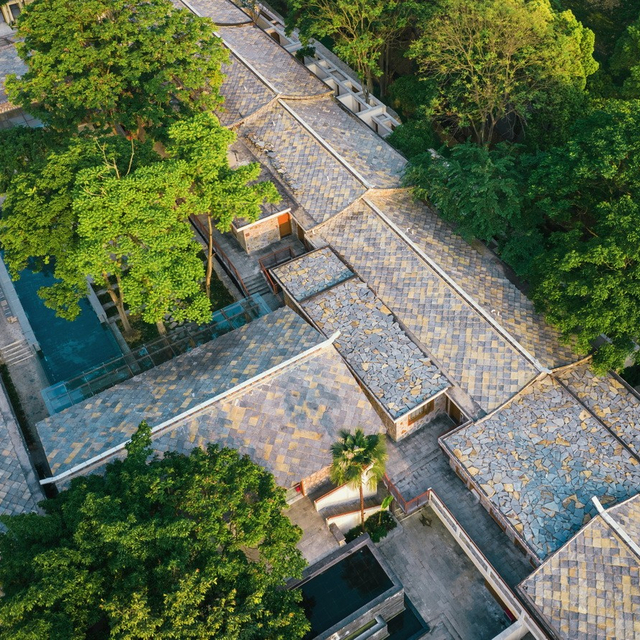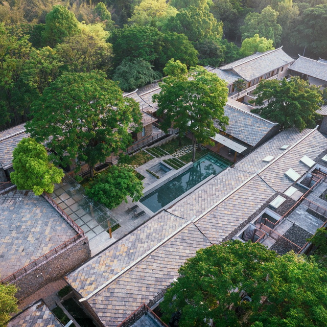 如此占地选址,如此美景自然,酒店依山而建,建筑物分布错落有致,却仅规划了61间客房,酒店共两层楼,站在二楼,周围是广阔的树林,层层叠叠,顺着坡势可以看到村落的轮廓。