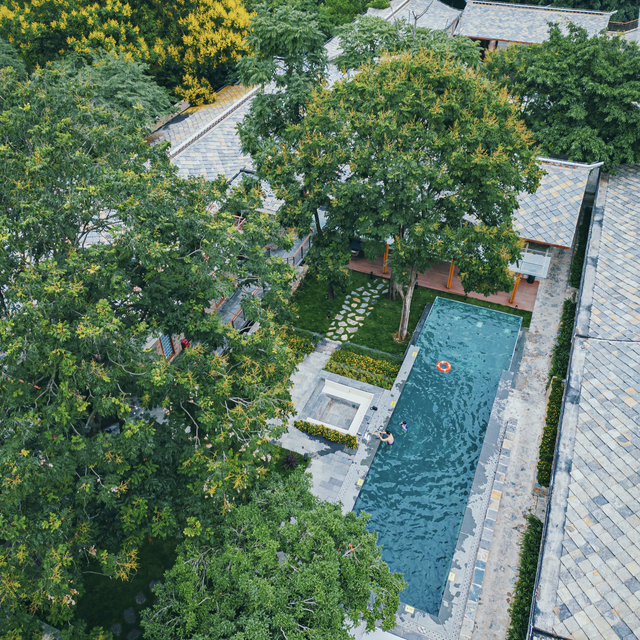 酒店为院落式布局,庭院中间是为无边星光泳池,入夜后,池底灯光亮起,如繁星坠落,满目都是梦幻,分不清虚实,人间值得!