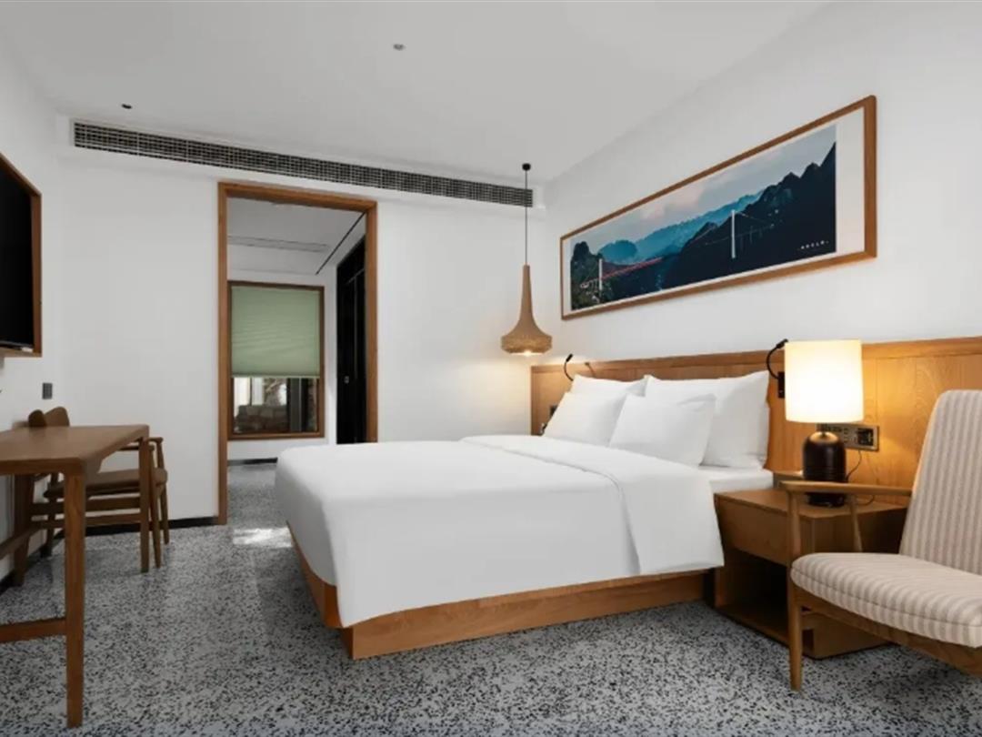 客房间内饰自然简约风,白色作为主色调,原木色点缀,各色房型都有。每间客房或配置泡池、前庭,或带阳台、榻榻米。其中,庭院大床房/标间,面积58平起,带前庭泡池。房间内装饰元素来自于当地传统文化元素,例如布依族手工艺中的竹艺编制、染织、陶艺、铜器等等。