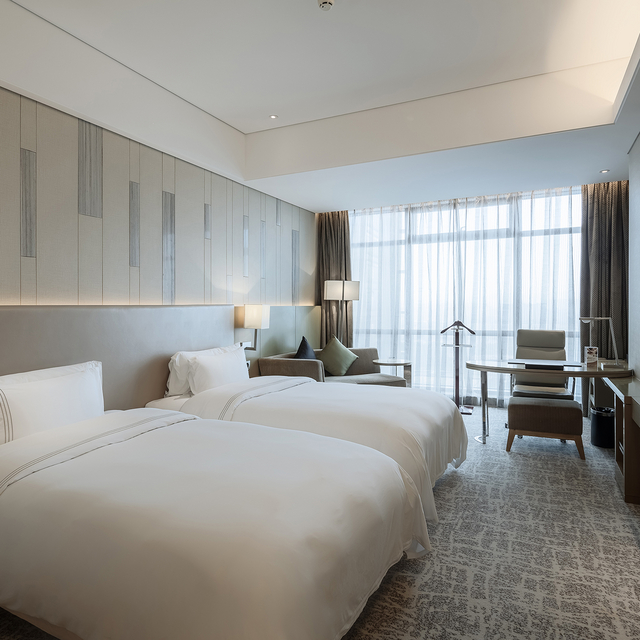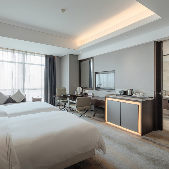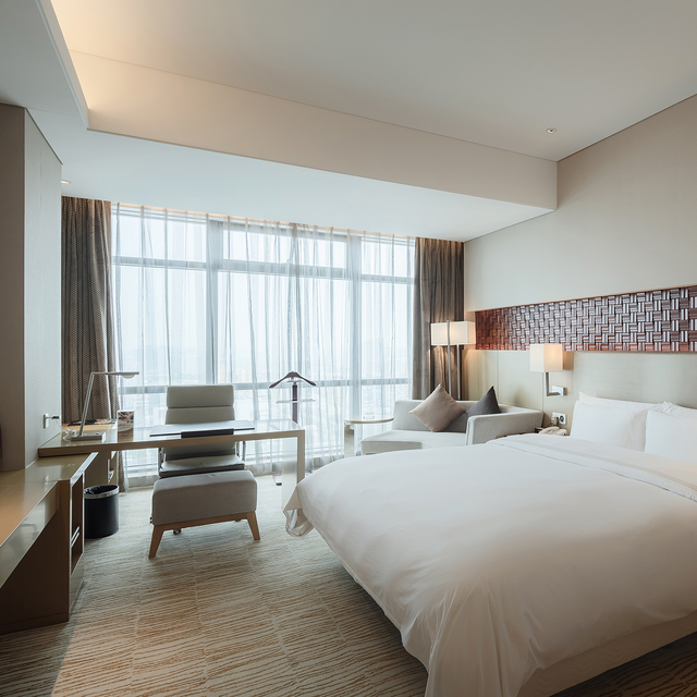 酒店共有423间客房和套房,温馨色调之下,以简约现代风为主打,落地玻璃设计,引自然光线入室,明朗清新。客房整体空间层次分明、视野开阔,沙发、写字台是标配。