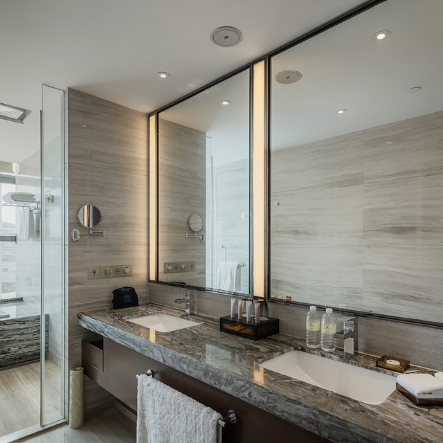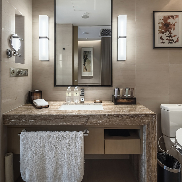除此之外,客房均配备浴缸,洗浴空间干湿分离;电控自动调光玻璃,确保隐私;洗浴空间配备日式智能坐便器(卫洗丽),冬日必备;房间开关是触控的,方便且现代。