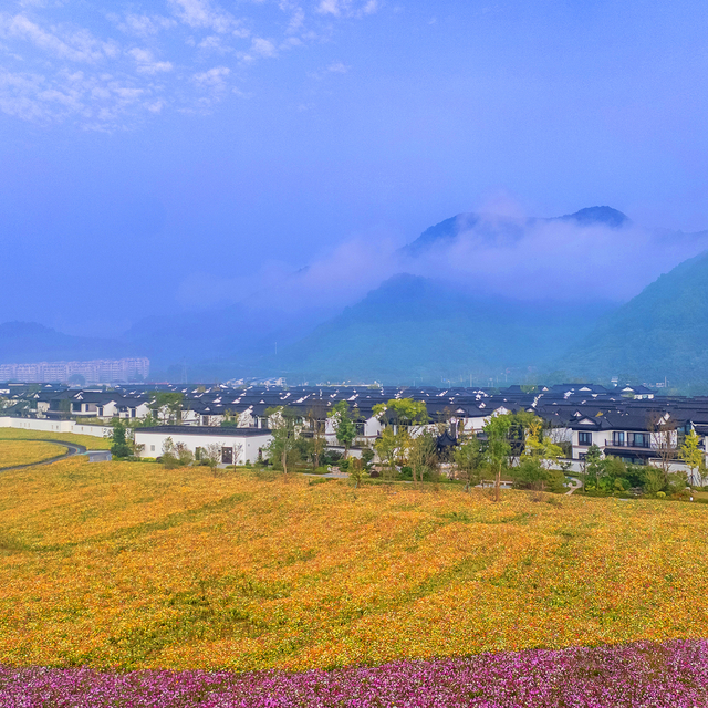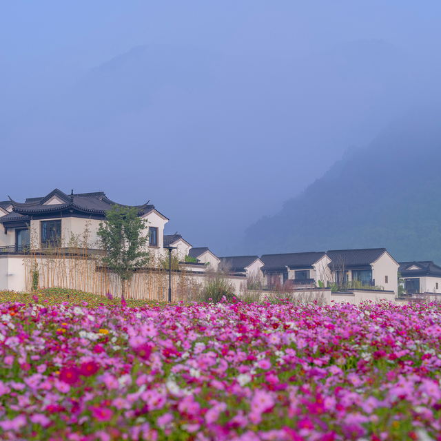 酒店位于东依武岭门之巍峨,北傍雪窦山之灵秀,被群山田园环绕的同时,它还临剡溪而建,自带花海区域(四季花海各不同)…可谓是真正的山水间栖居,静谧隐逸。