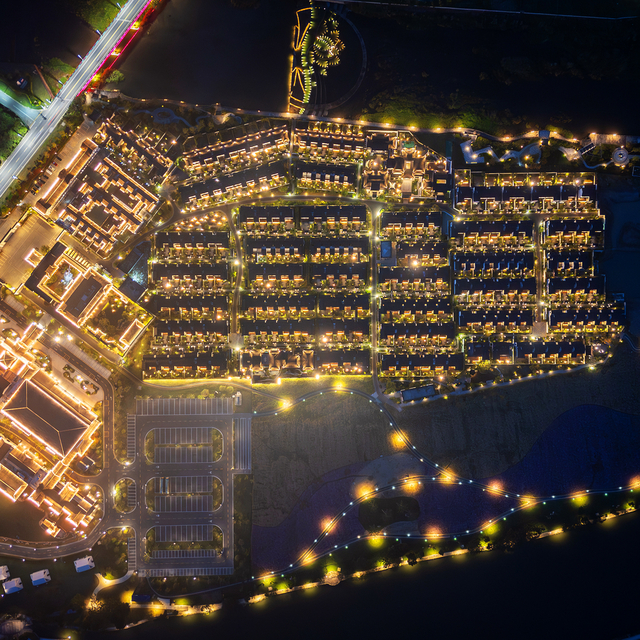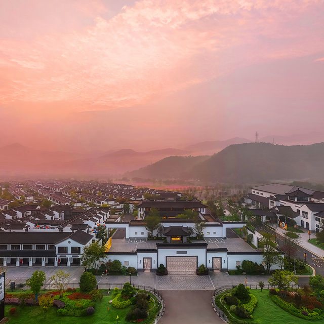 整个酒店(包括花海、人工湖),总建筑面积达到9.6万平,整体建筑深植徽派风格之精髓,外观为白墙黛瓦的别墅造型,从空中俯瞰,就像是空降于山水之间的“桃源村落”。