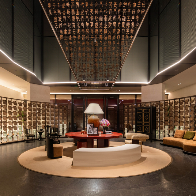 没有特定的前台区域,可以让客人与工作人员之间有了更亲密的互动。整个空间的设计灵感主要来源于一对礼器——礼乐编钟和季子飤盂(编钟在下,飤盂在上),环顾四周,不仅有编钟融入的木+石交融的围墙,还加入了有百家姓氏的竹刻技艺;头顶上方,更将诗词装置悬空而设…古韵氛围拉满。