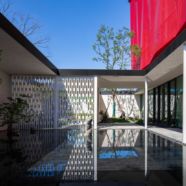 从踏入酒店正门的那一刻开始,专属于花间府·怀槿的沉浸式园林之旅就开始了。落客区连接着大堂,庭院水系、绿木花艺与日光交织,将红盒的光韵反射其中,呈现出如梦似幻的时空效果。因此,每位到达之人,都忍不住按下快门,留住眼前的美。