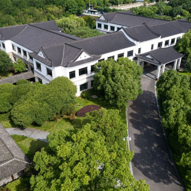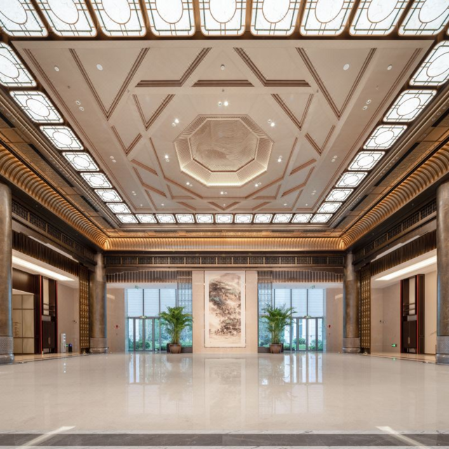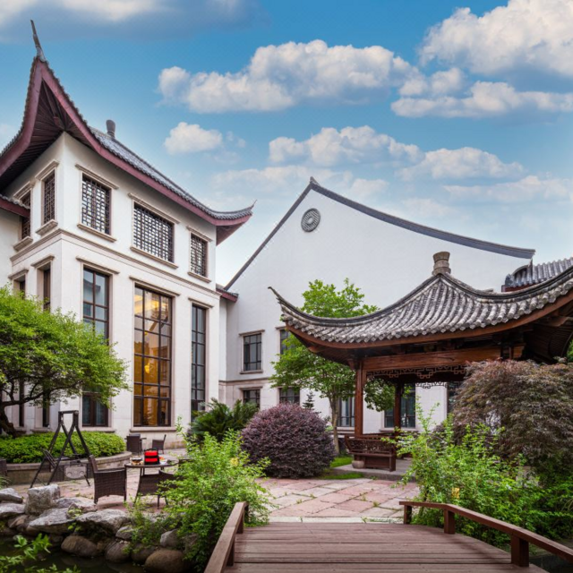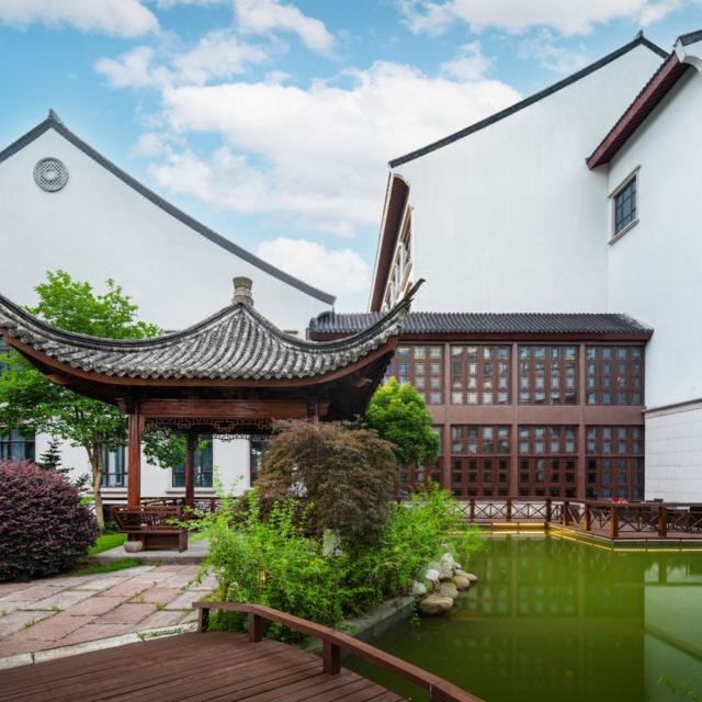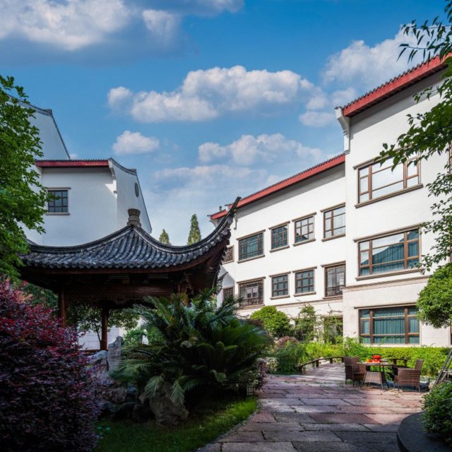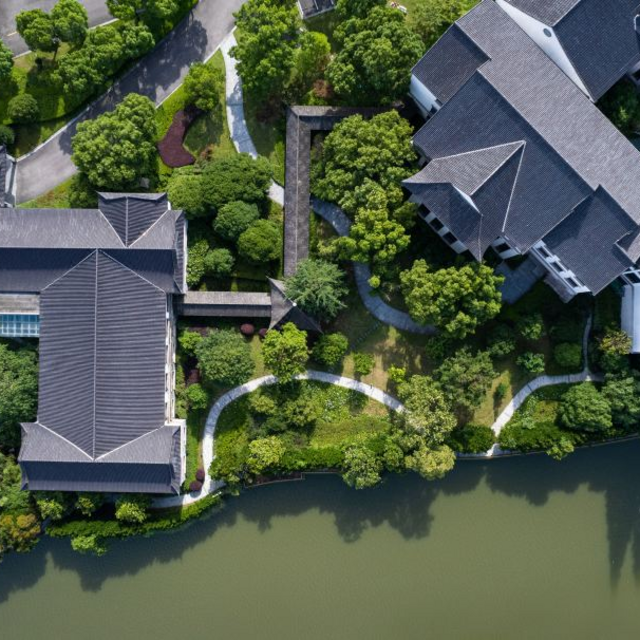 宾馆外观沿用了江南水乡建筑中白墙黛瓦的元素,四周绿林环绕,与建筑相映成趣。庭院深深曲径通幽,空间层次感丰富。运用中国传统园林建造中的“借、漏、透、障”元素,呈现出婉约清雅的氛围感。