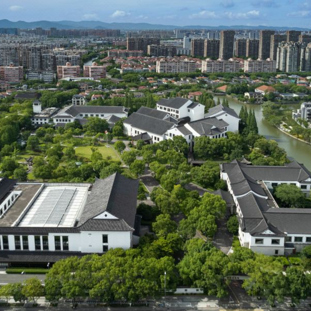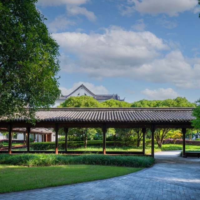 黛瓦白墙、碧水苍翠间,池水映着树木的绿,天空蔚蓝而辽阔,微风吹过,夹带着林间传来的鸟鸣,尽显江南优雅淡然之态。