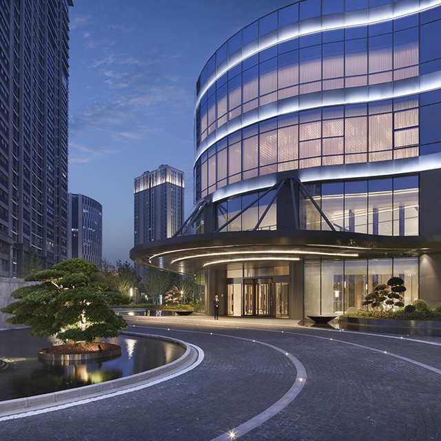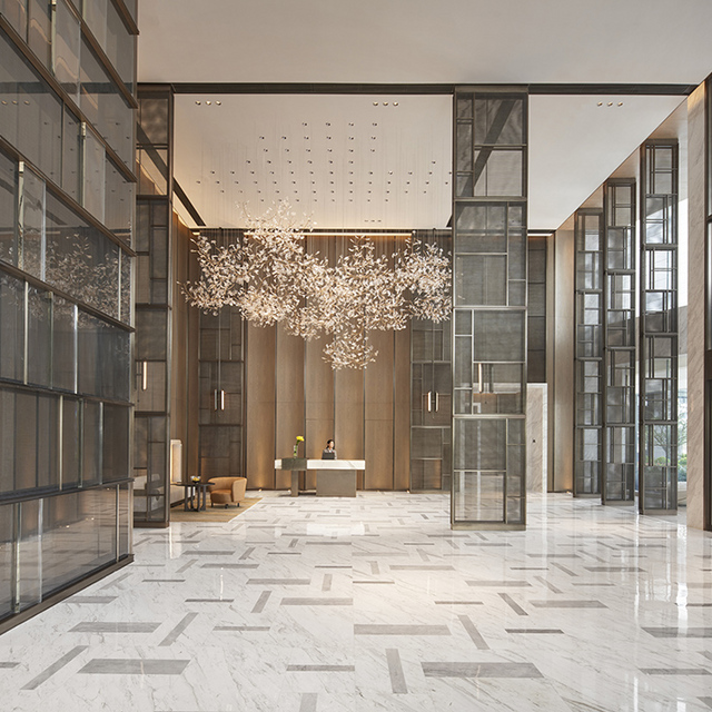 大堂的灵感来源于古琴曲《禹会涂山》,正对入口的巨型艺术玻璃砖屏风,是一尊透明显示屏,开启时,与光影辉映,就像奏响了一曲古琴曲;