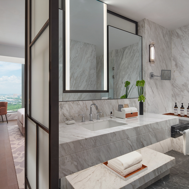 位于酒店35F的健身中心和云端泳池,能满足运动达人所需。其中泳池采用了落地窗设计,采光透亮,视野开阔,畅游其间,向外望去,水面似与天际相接,拍起照来也是非常带感。