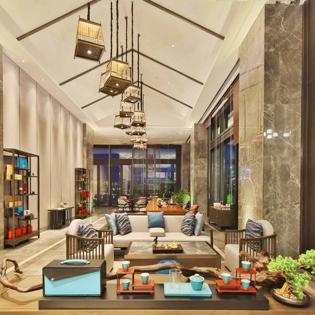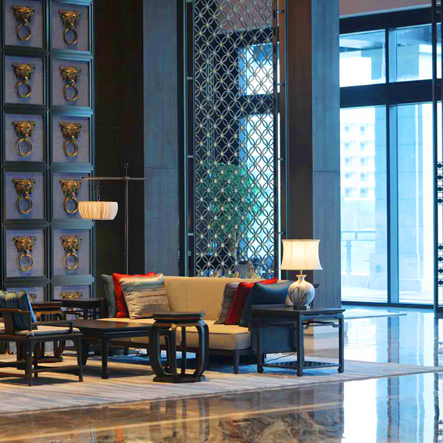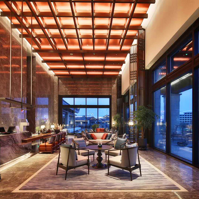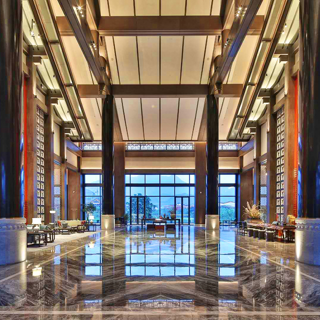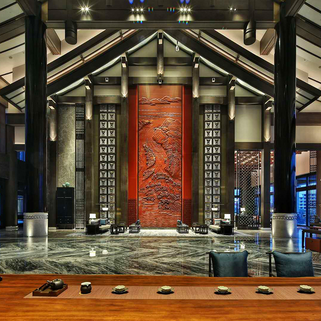 走进大堂,你会穿过一条长长的走廊,走廊两边有6个形态表情各异的雕塑人俑,接着便是恢宏壮丽的一刻,挑高24米的设计,在全国酒店中都属罕见,视觉空间开阔无比;由“悬山顶及穿斗式构架”的形式演变而来的天花,更是震撼,大漆圆柱及青石墩,墙面装饰采用汉代铺首,并以现代手法演绎!