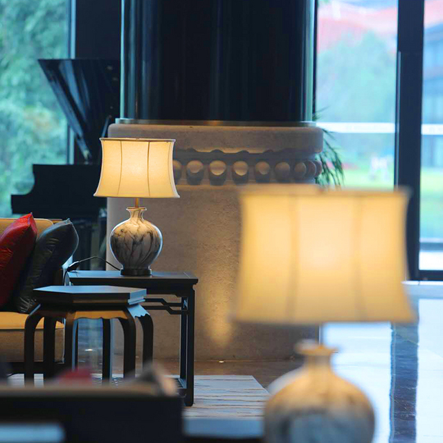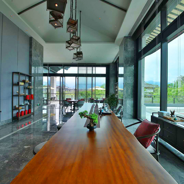 左手边为大堂吧,与步入式接待厅是互为对称的两个大堂辅助空间,高大落地窗直面人工湖,下午茶时光看湖看山品茗,巴适!
