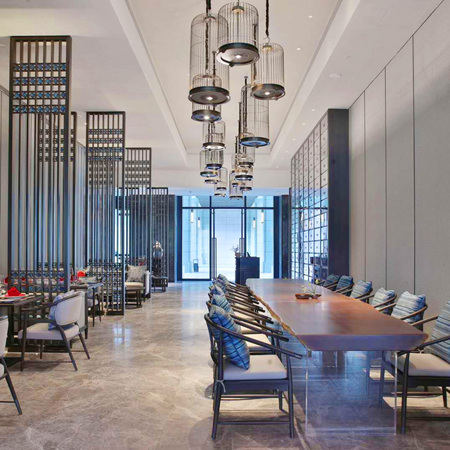 区别于全日餐厅的轻松随意,中餐厅的氛围更正式。设计强调竖向直线条的高大挺拔感,以红色漆画搭配深灰木饰面,营造成熟稳重、古典优雅的就餐环境。大幅漆画艺术品以“山水花鸟”为主题,表现成都与自然山水的和谐关系。精致的汉代风格家具,增添怀旧细节与精致的奢华感。