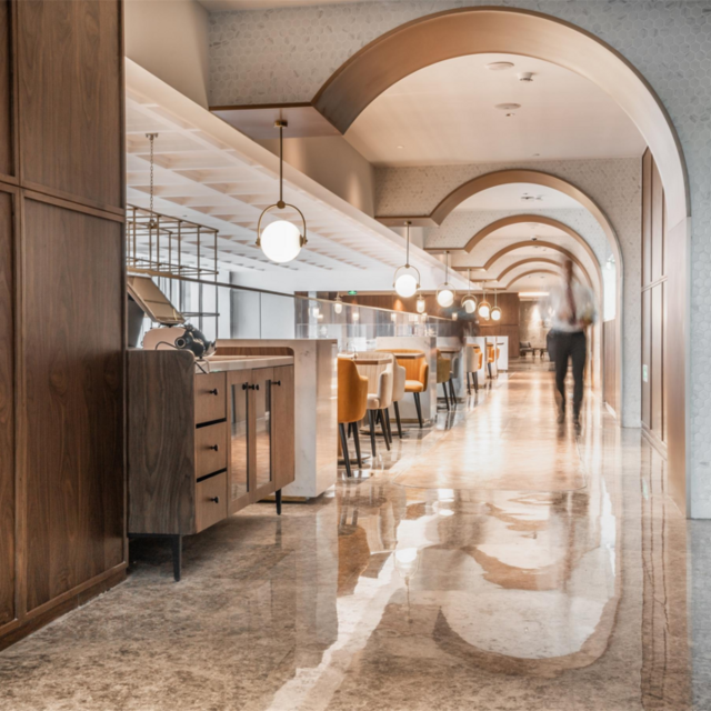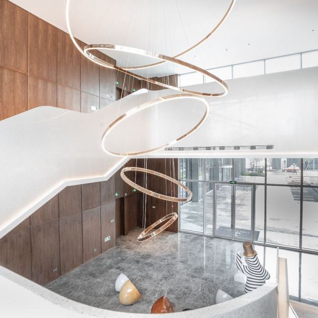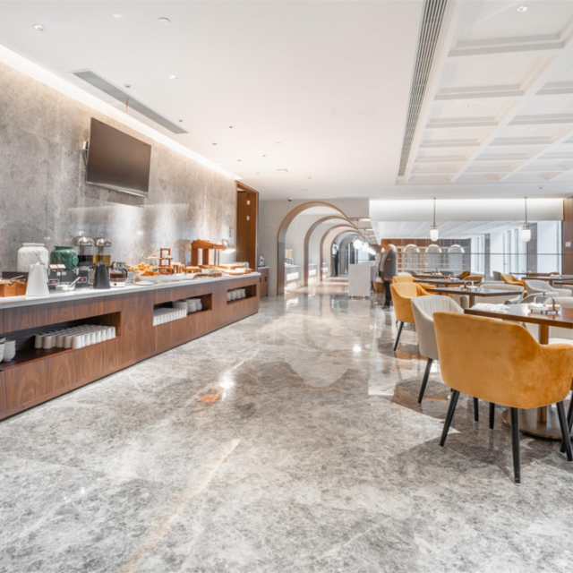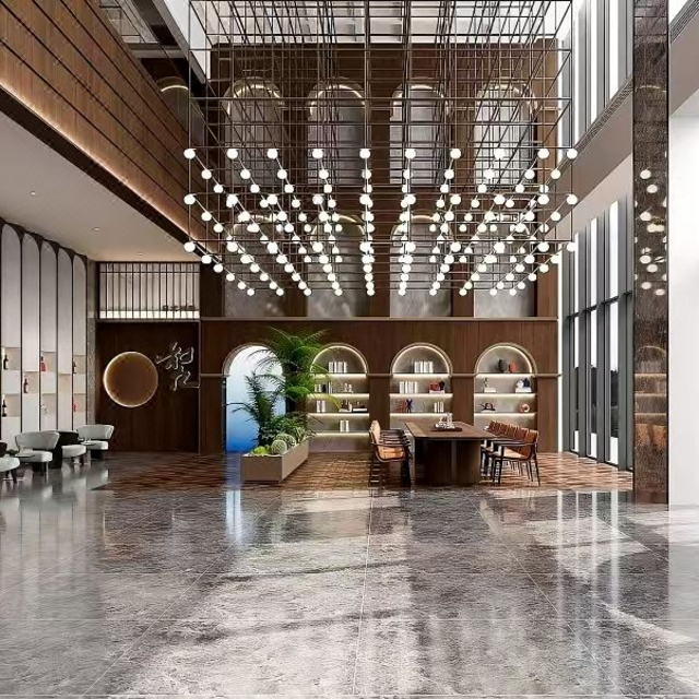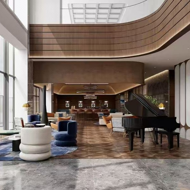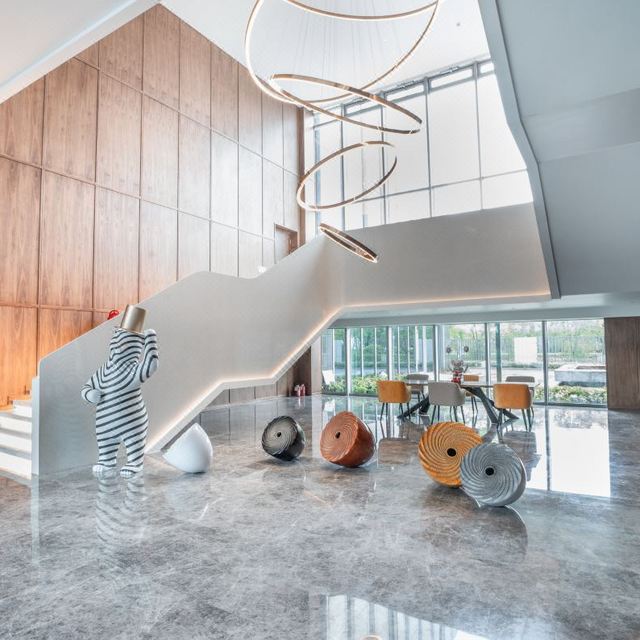 大堂内干练的线条勾勒出广阔的空间感,大理石与原木的交融更是增添了气韵。