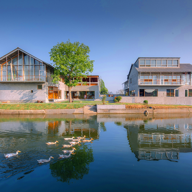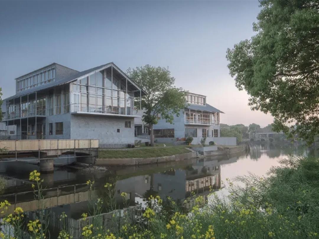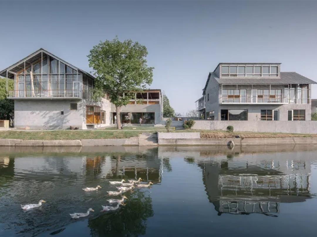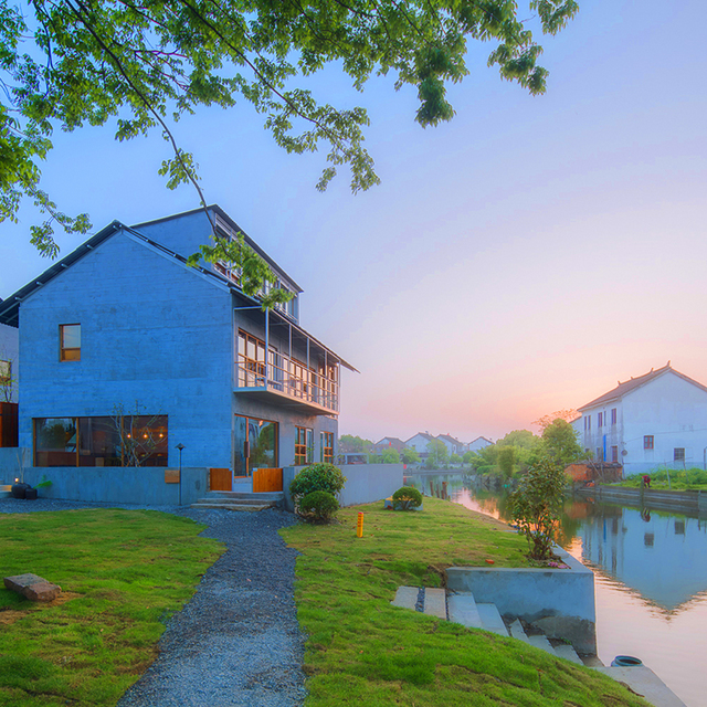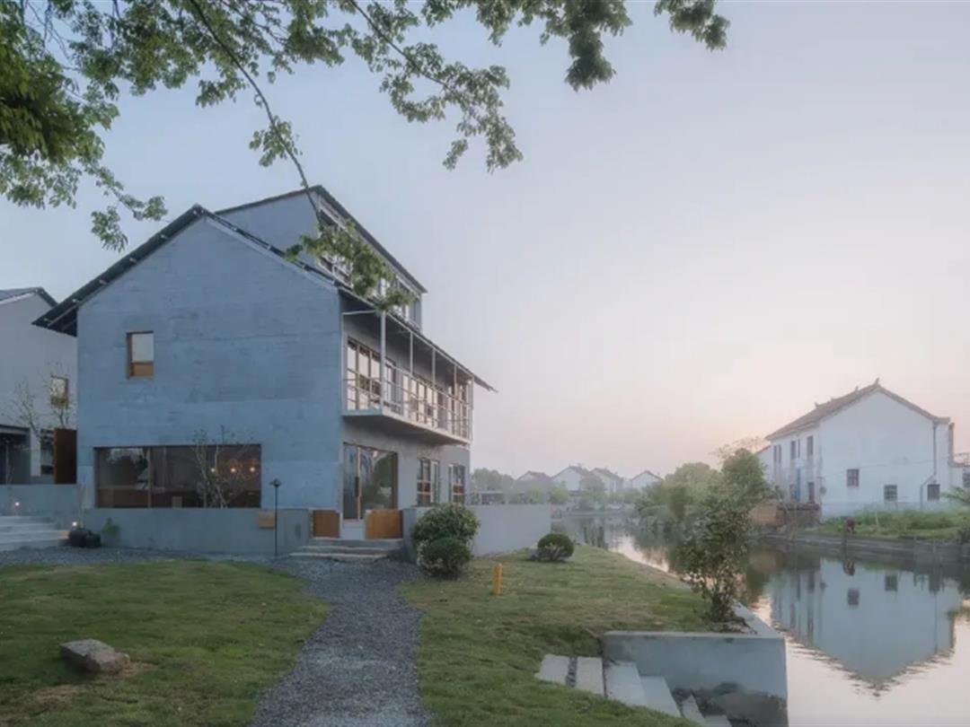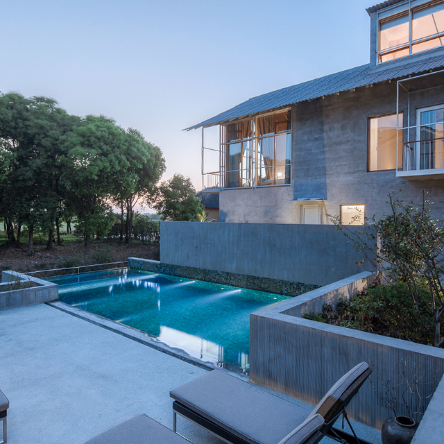 整体分为公共休闲和住宿两个区域,不同于常见的黑墙白瓦建筑,大乐用灰色水泥和大面积玻璃来释意水乡田园之梦,轻工业风般的设计,与周围景色自然融合。