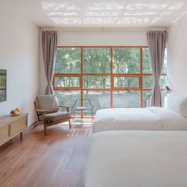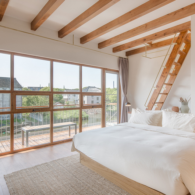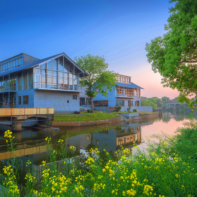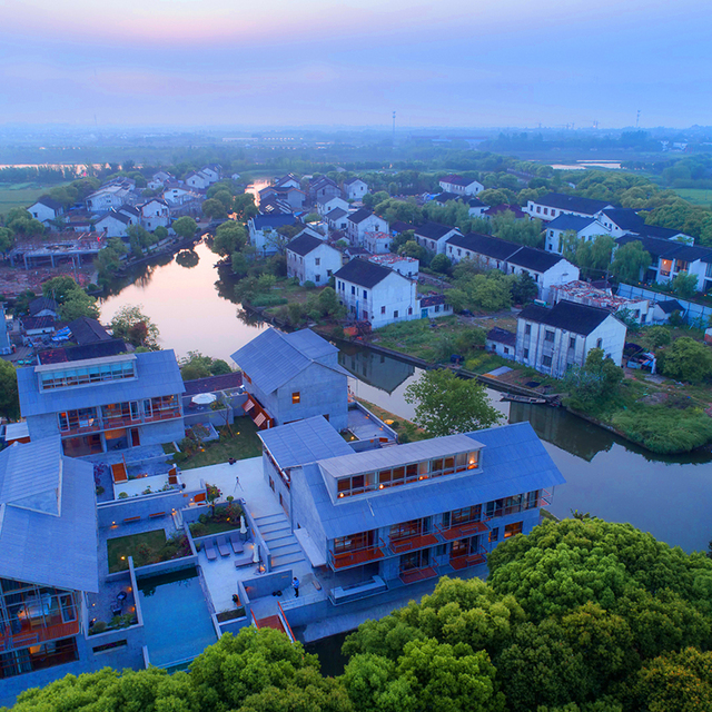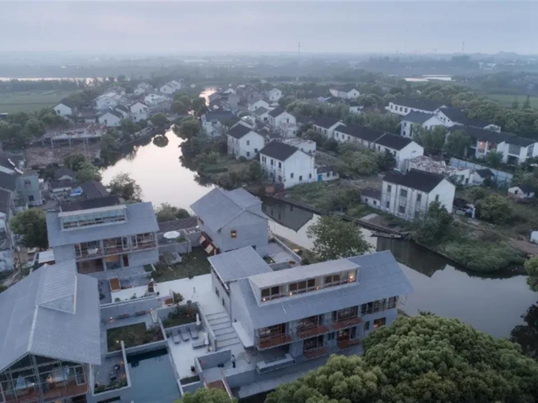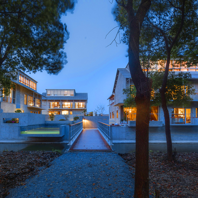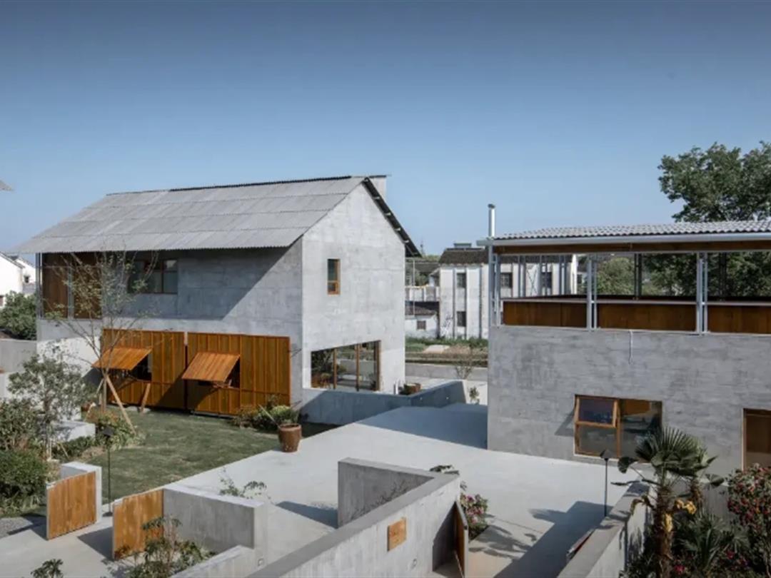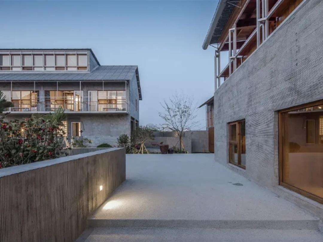 整体分为公共休闲和住宿两个区域,不同于常见的黑墙白瓦建筑,大乐用灰色水泥和大面积玻璃来释意水乡田园之梦,轻工业风般的设计,与周围景色自然融合。