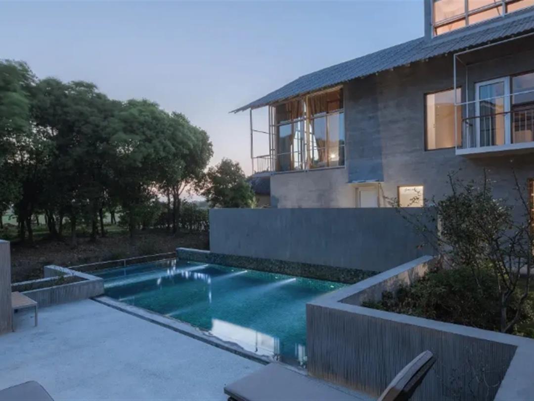 22间客房散落于4栋楼内,每栋楼都有自己的名字,名曰:青笠、蓑衣、斜风、细雨。烟灰色水泥质感的外观,洋溢着质朴和淡泊感。四栋楼,各自拥有独立的院子、客厅、餐厅和厨房(不可做饭)。