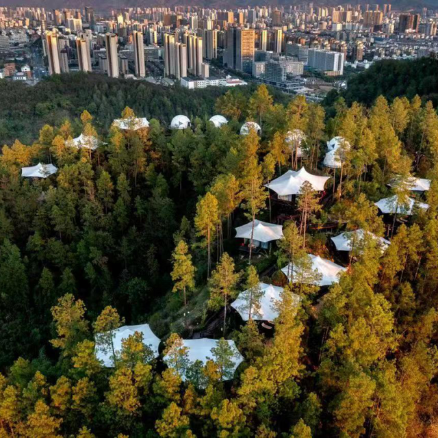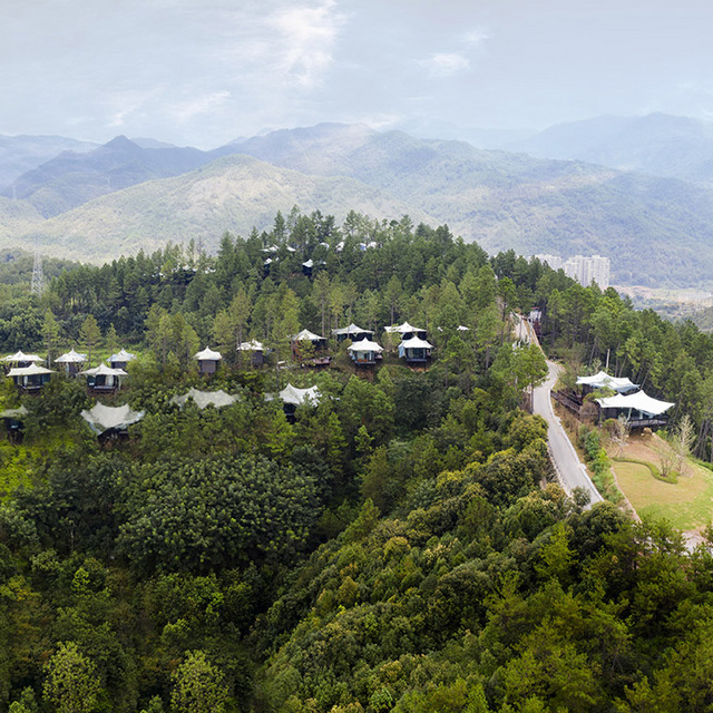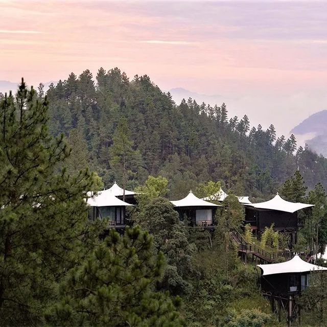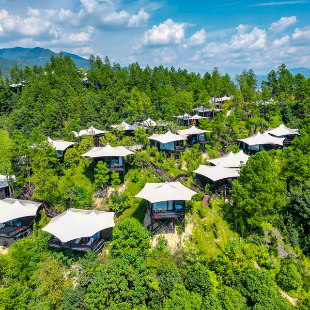 一幢幢白色帐篷别墅,顺着山脉肌理,翩然绽放于正在悄然变色的山野间、悬崖之上。
