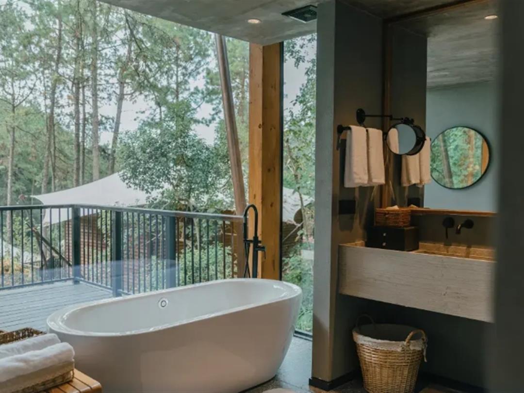 酒店由50栋森林树屋、7栋穹顶星空屋组成,每栋客房都拥有阔绰面积的景观阳台,全程都有管家服务。