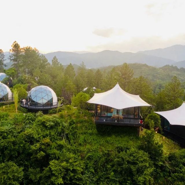 穹顶星空屋包括天枢、天璇、天玑、天权、玉衡、开阳、摇光7幢,以北斗七星古称来命名,掩映在山林云海间,仿佛漂浮云端。白天让你以180°大广角饱览森野,傍晚看霞光慢慢渲染天空,夜晚把星星一颗两颗三颗四颗连成线,陪玩数着繁星点点入睡…浪漫且梦幻。