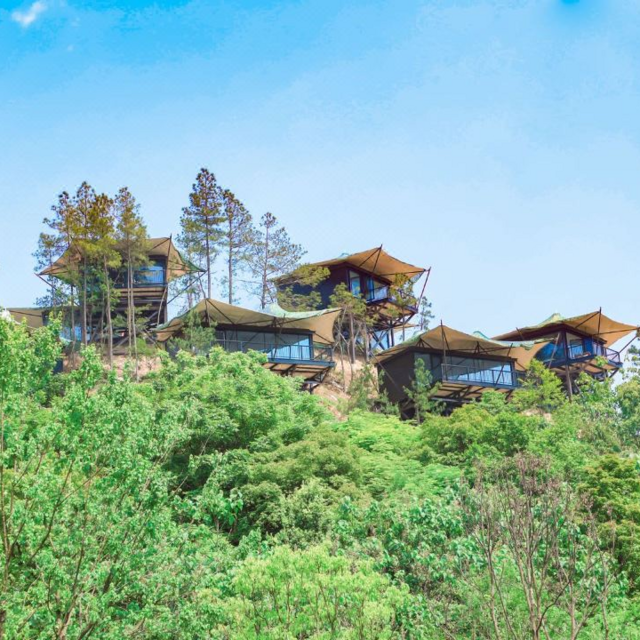 房型以位置来命名:居于山下的为森系木屋,居于山中的为观岚木屋,山上为云端木屋,50栋独栋帐篷木屋,错落有致的分布,并以森林栈道连通。