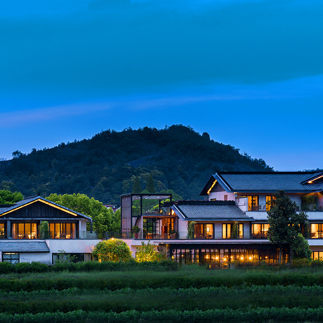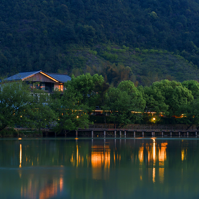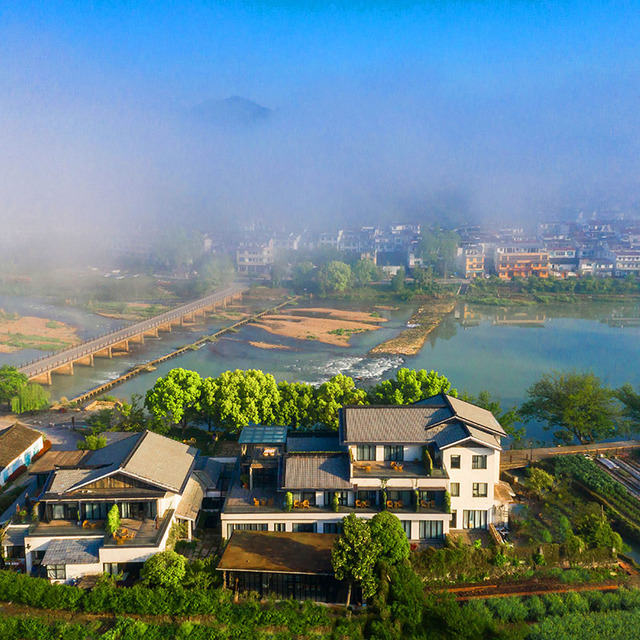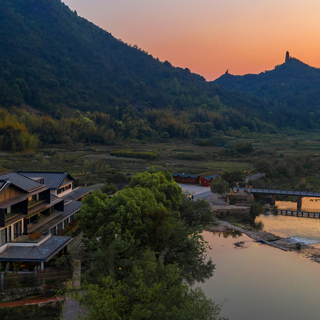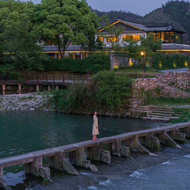先说位置。近云·丽舍选址仙都景区中,位于小赤壁入口,群山环绕间,是四季更迭的田园与门前发出潺潺水音的河流,一座石梁桥将村镇与美宿衔接,出门几步便是当地有名的彩虹道,晨起或日落时,散步、骑行都能遇到当地人悠闲而过。河水畔,偶有老牛和白鹭驻足,更有神仙人间的既视感。