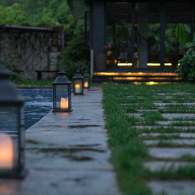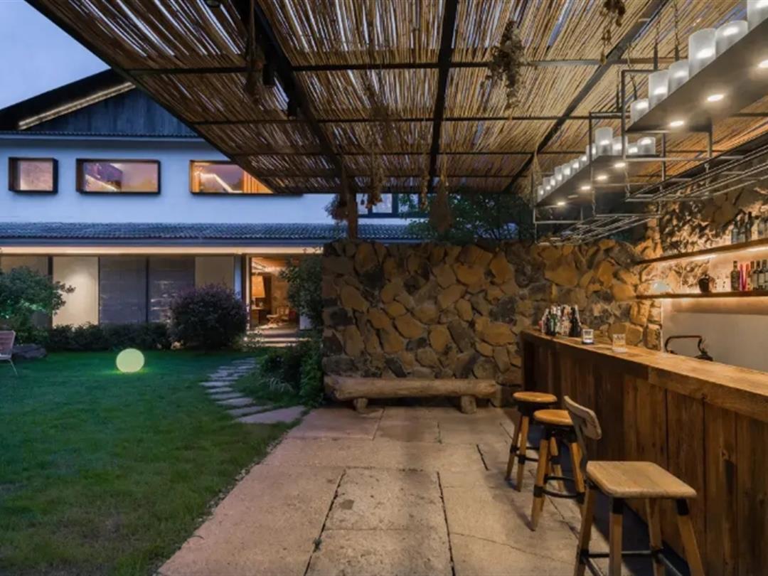 从前台一旁的侧门出去,便是美宿院落,有1200㎡,主要为露天酒吧和户外泳池两大区域,春夏之交有绣球花,夏天有杨梅,秋天有柚子,冬天可坐忘冬雪,全年都被花花草草填满。