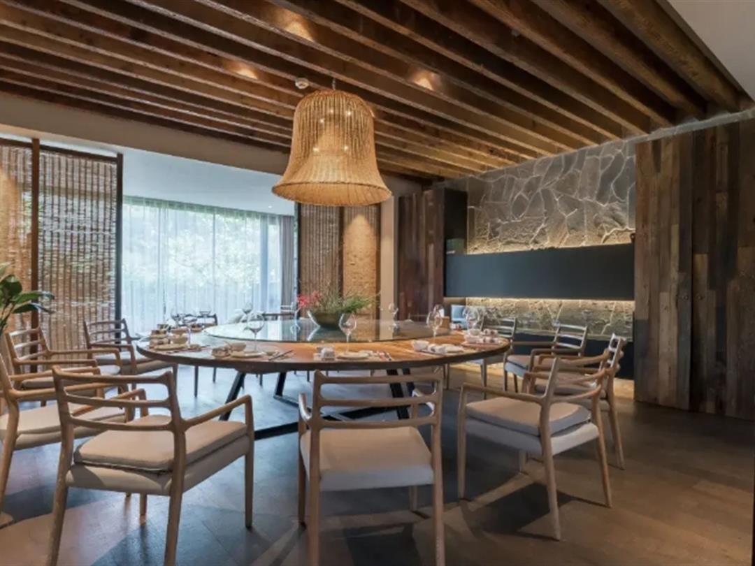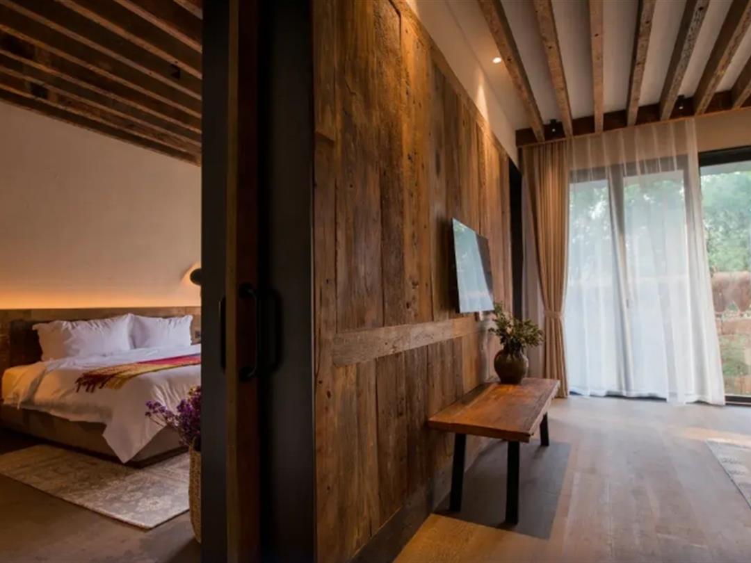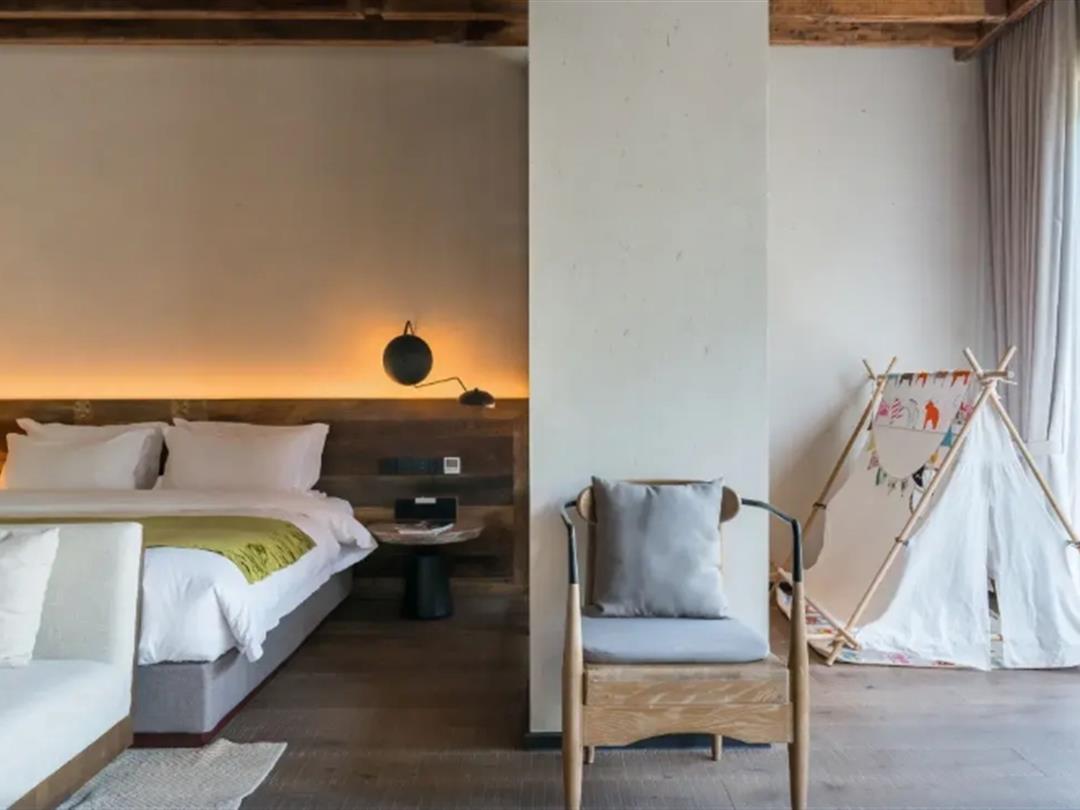 再说设计。藏于仙境之中的美宿自然也是一幅画般的存在!种满花草果树的近云·丽舍,经过几年的植物,已经拥有花园般的环境。它的设计由外婆家的御用设计师孙云亲自操刀,步入室内,完全就像走进了一座艺廊,既与本地原乡风味交融,又有中式古典园林的仙气,百年老木与石材随处可见。