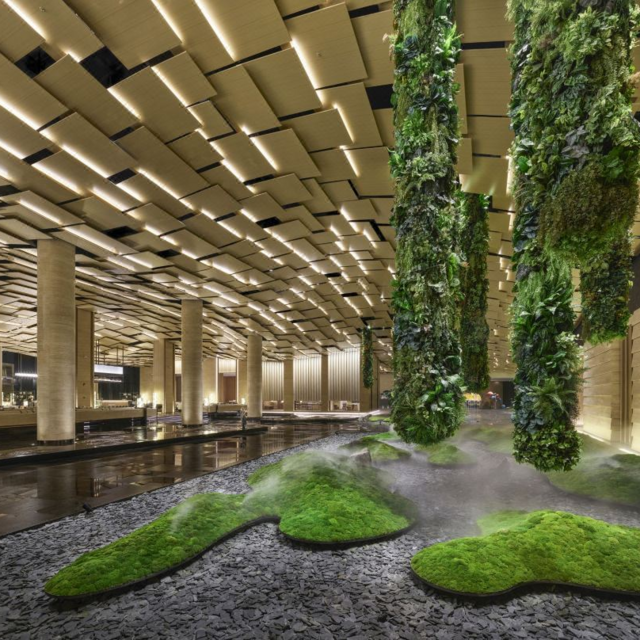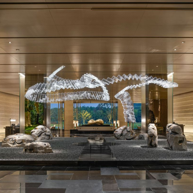 青雅中餐厅,运用自然元素进行艺术设计,提取“鱼”、“石”为主要创作元素,梦幻唯美充满灵性的同时,青绿色调亦配合中餐厅“青雅”主题,以创意融汇食材,为食客带来全新味蕾体验。