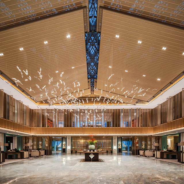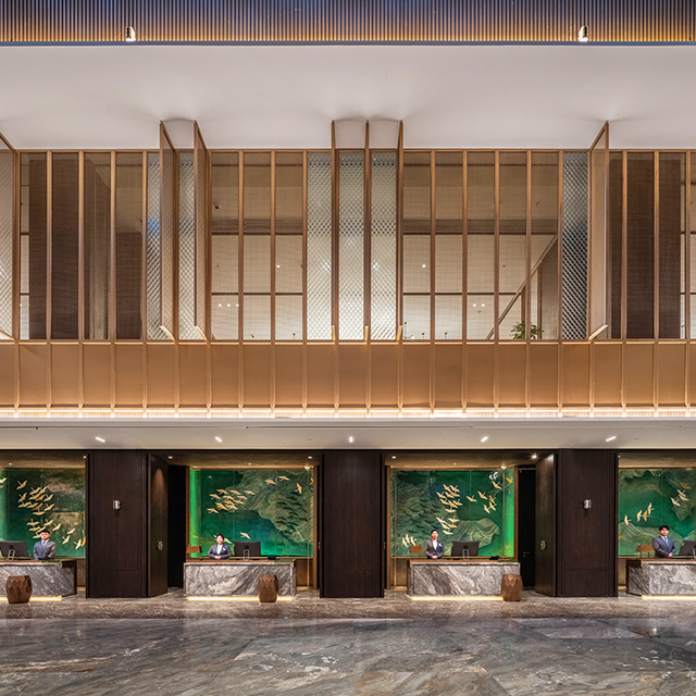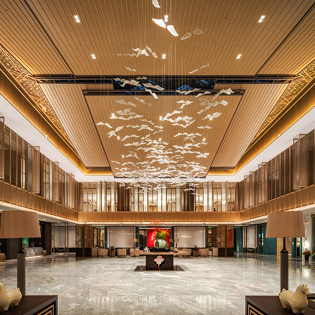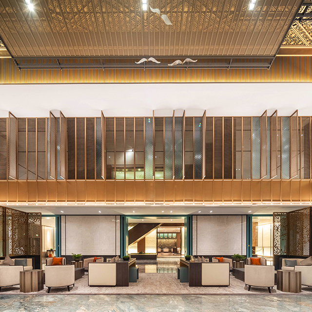 走进大堂,蓝金沙地面在灯光照耀下,大面积的流动纹理,显得格外大气;镂空金属屏风隔断,营造出独特新中式灵动质感;四周细木栅格窗代替现代化的玻璃窗,中央上方借鉴了古镇徽派建筑风格,独特的江南水乡韵味油然而生。