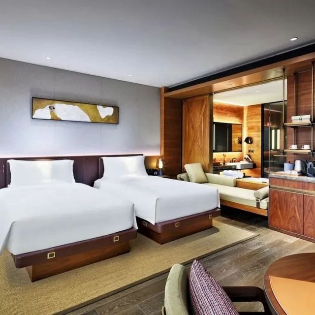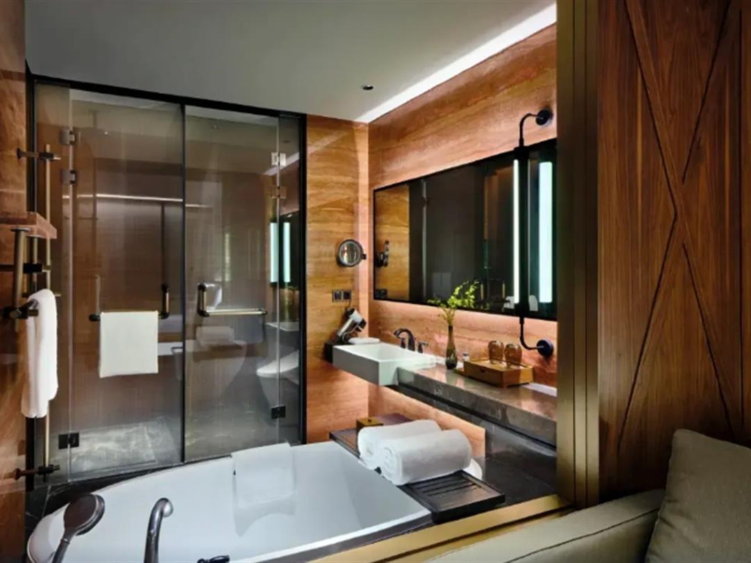 在房间日常使用备品上,出手大方:飞利浦55寸液晶智能电视、JBL音响系统、Nespresso咖啡机,卫生间干湿分离,摆放着戴森吹风机、德国汉斯格雅卫浴、BYREDO洗漱备品以及智能马桶…带孩子入住,也可让酒店客房部提供儿童拖鞋、浴袍等用品。