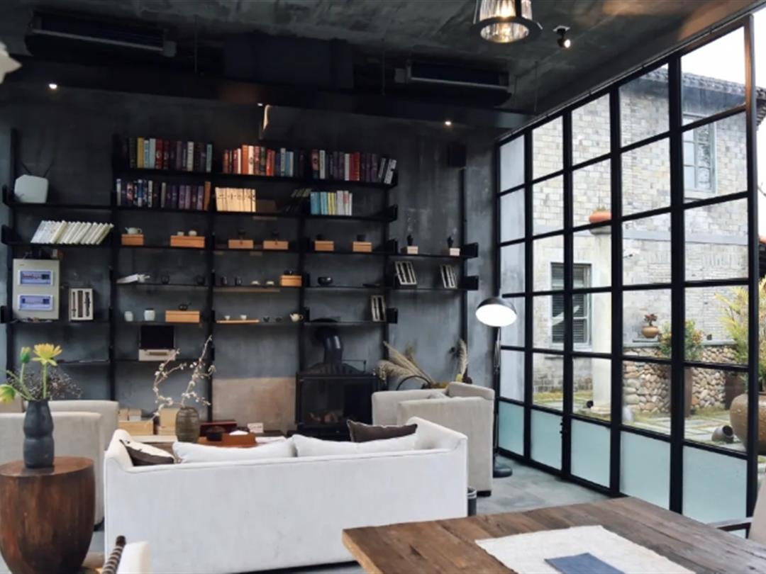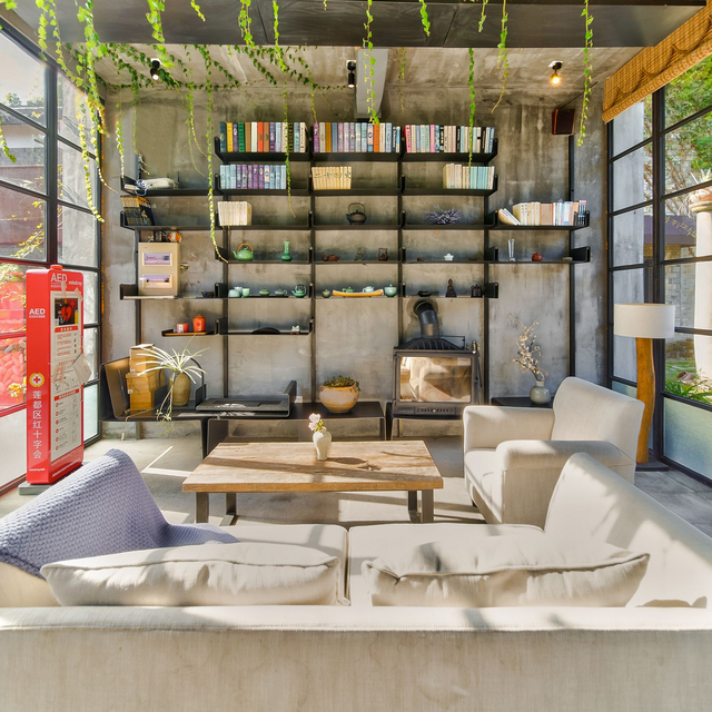 其中步入酒店庭院中庭,水泥盒子般的书吧引入眼帘时,相信你会有眼前一亮的惊艳感。水泥与金属框架构造出硬朗的现代工业风,而通透的落地窗户以及中国红的金属外壳又赋予了它厚重的年代感,与周围的老房子一点都没有突兀之感。