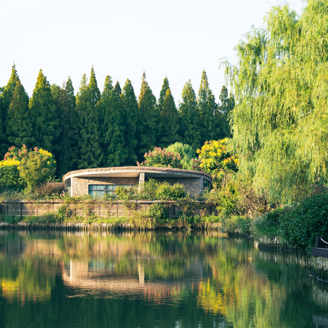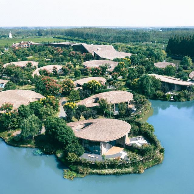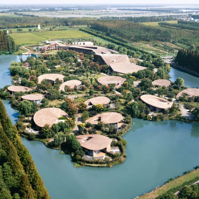 一栋栋高低不同的多坡屋面建筑铺铺展在湖畔的田野之上,环境静谧又富有野趣。