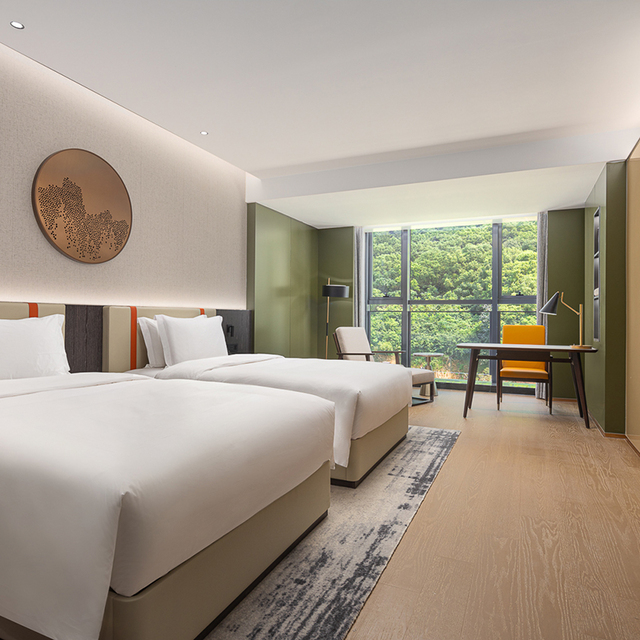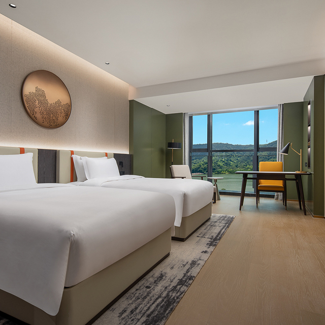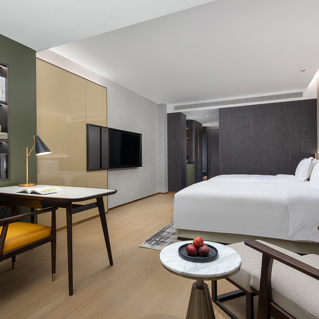 为了保证住客体验,温德姆仅保留了116间客房及套房,面积做到了41㎡起跳,房型多样,有商务房、商务湖景房、行政房、行政湖景房、行政套房和大使套房,每一间都有落地玻璃设计,引自然光线入室之余,也能从不同角度观山或赏湖。