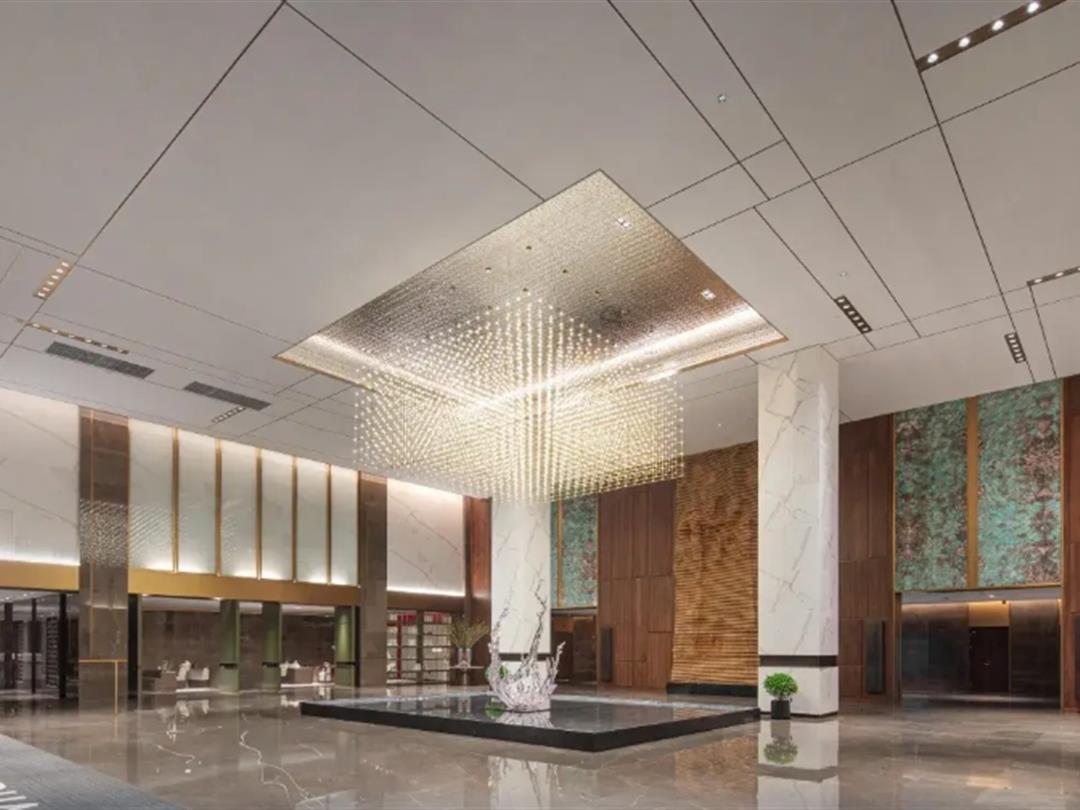 抵达大堂,第一眼就被中庭景观池+艺术装置+水晶灯饰所吸引。