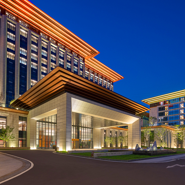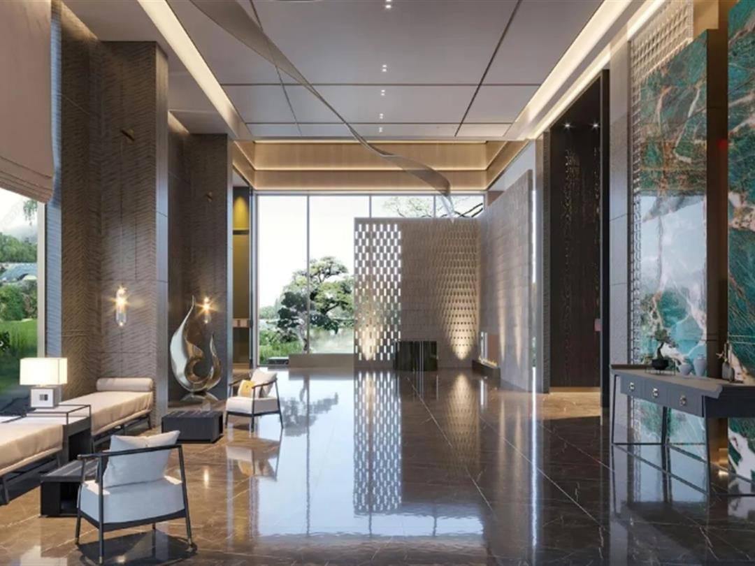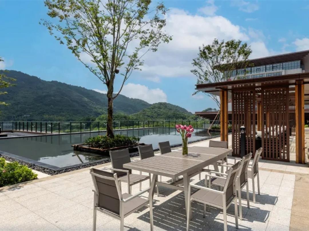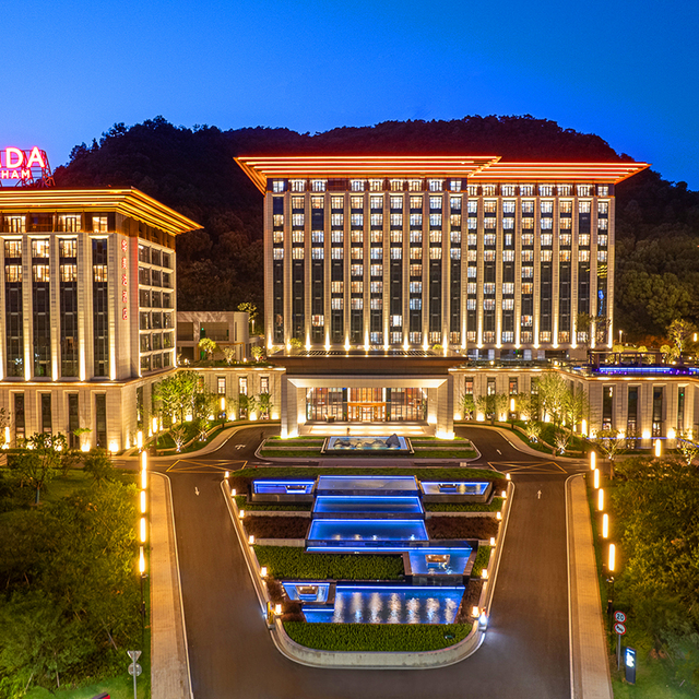 酒店外观摒弃高楼建筑,以沉稳的中式府邸作为主打,与山水交融,营造出满分的度假氛围。