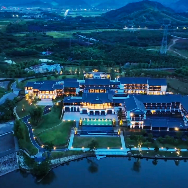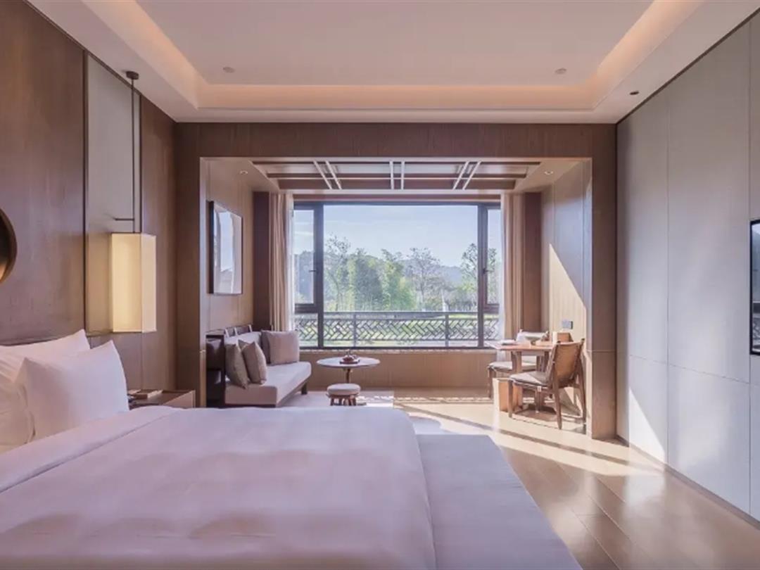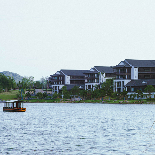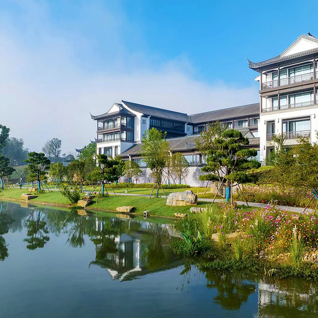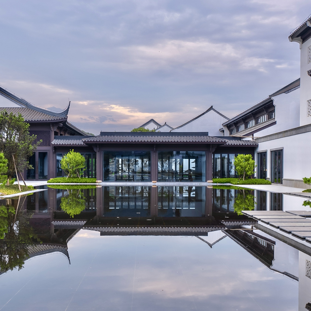酒店的建筑及室内设计,包括每个空间和客房的命名,也都蕴含着足够的诗意浪漫情怀,如:酒馆为「李白」、茶室为「陆羽」、中餐包厢为「大观雅席」等。所有的建筑均为白墙黑瓦的的徽派风韵,有着跨越时间和空间的东方美感;水系环绕,串联起一座座新中式空间。