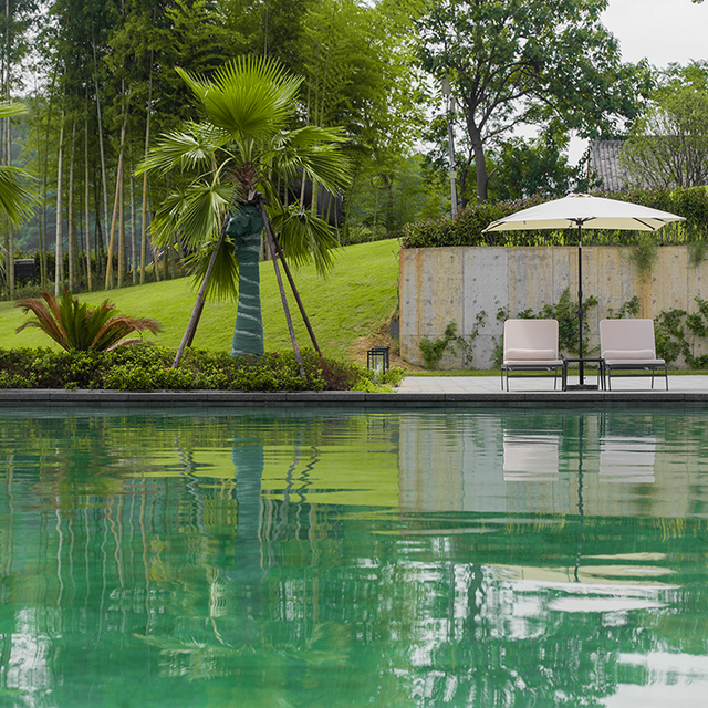 泳池名为「扑通」,室外直面湖光山色,盛夏季非常火爆;室内泳池自带品杂志封面感,色泽与波纹设计,相当有意境。
