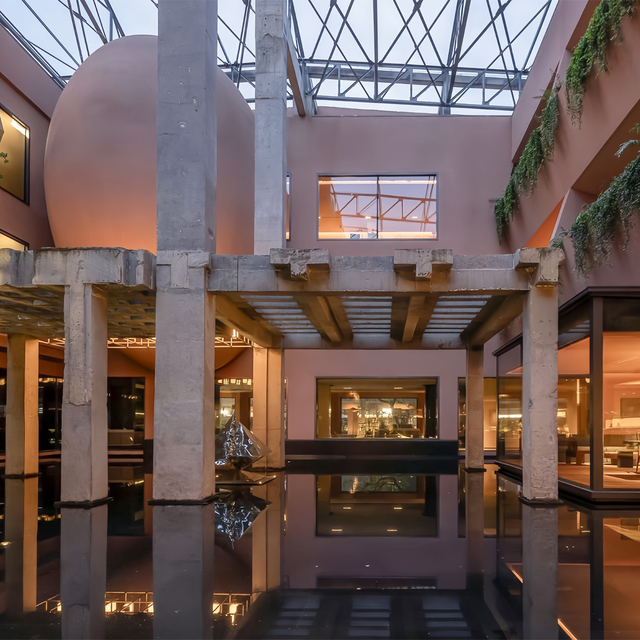 酒店及绍兴天地原址为绍兴781芯片厂,代表着绍兴盛极一时的工业文明。设计师团队以“工业旧址焕然新生”的主题,在酒店内部保留了芯片厂原有的桁架,打造了一个水景庭院。
