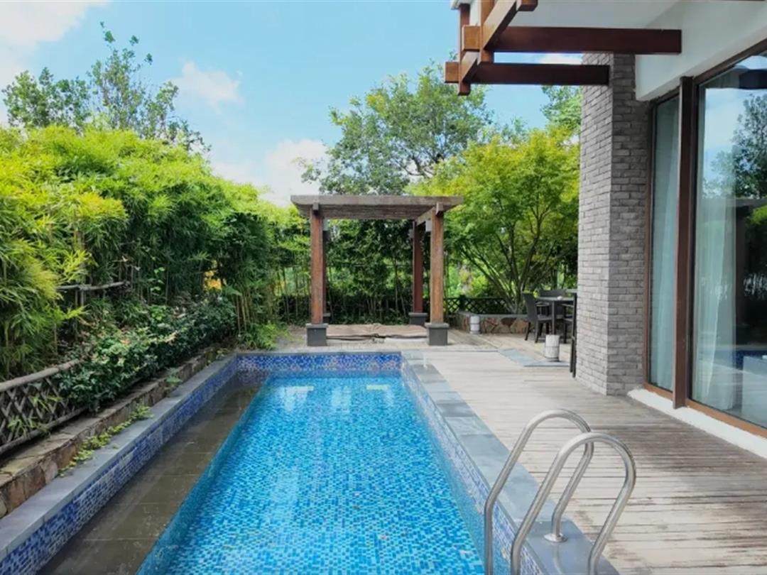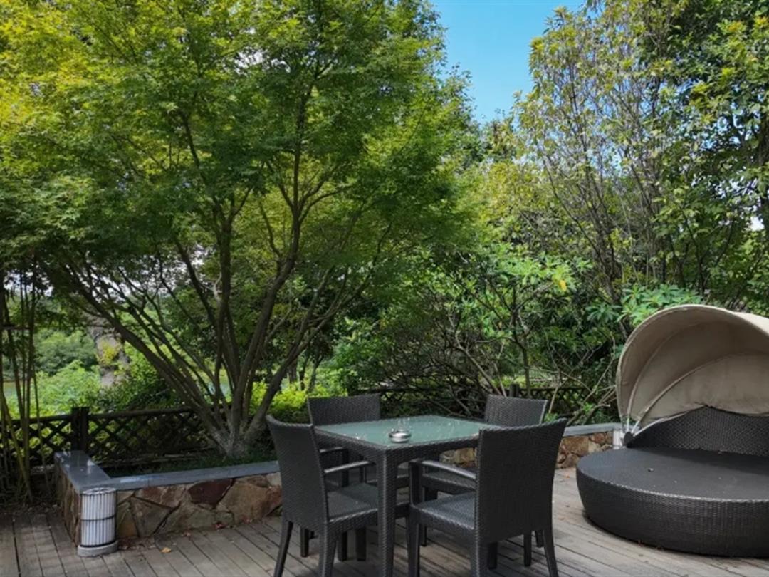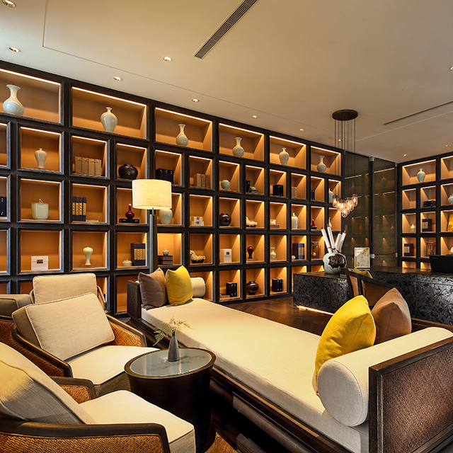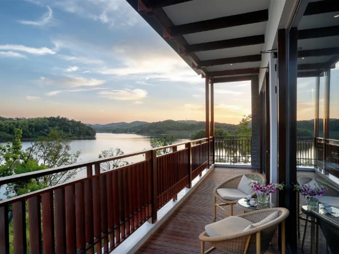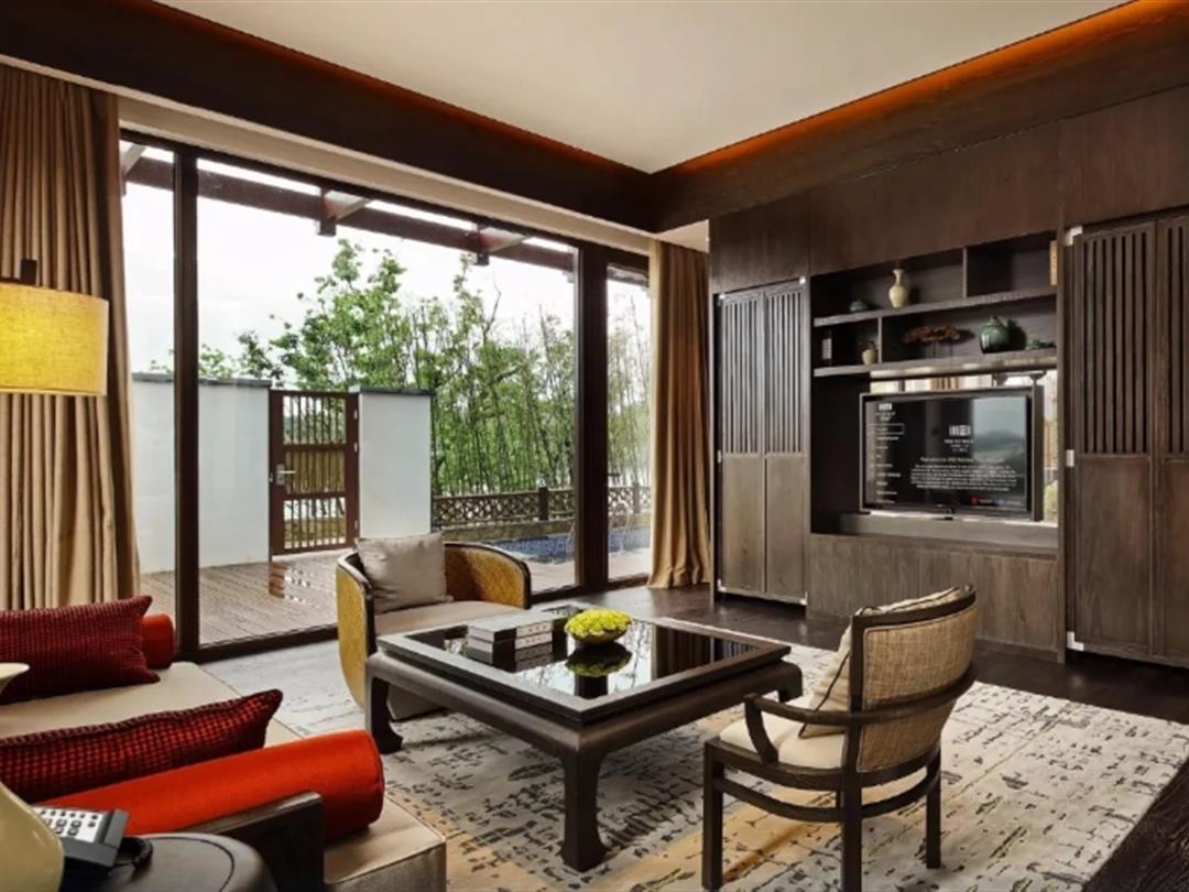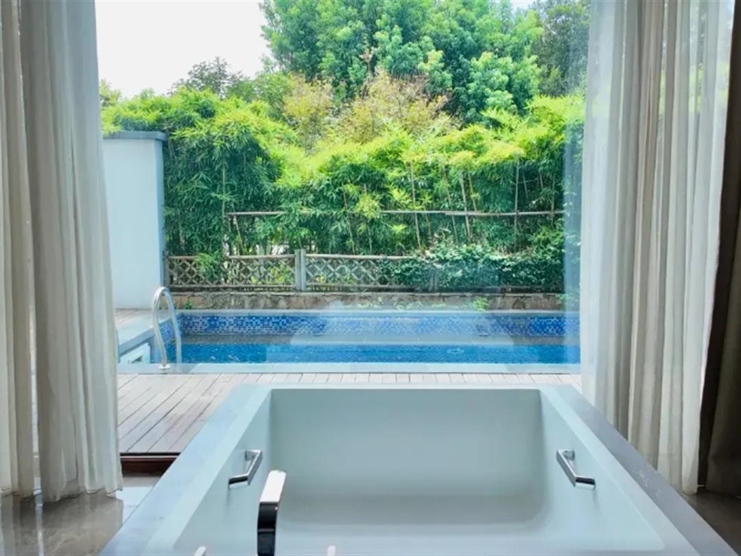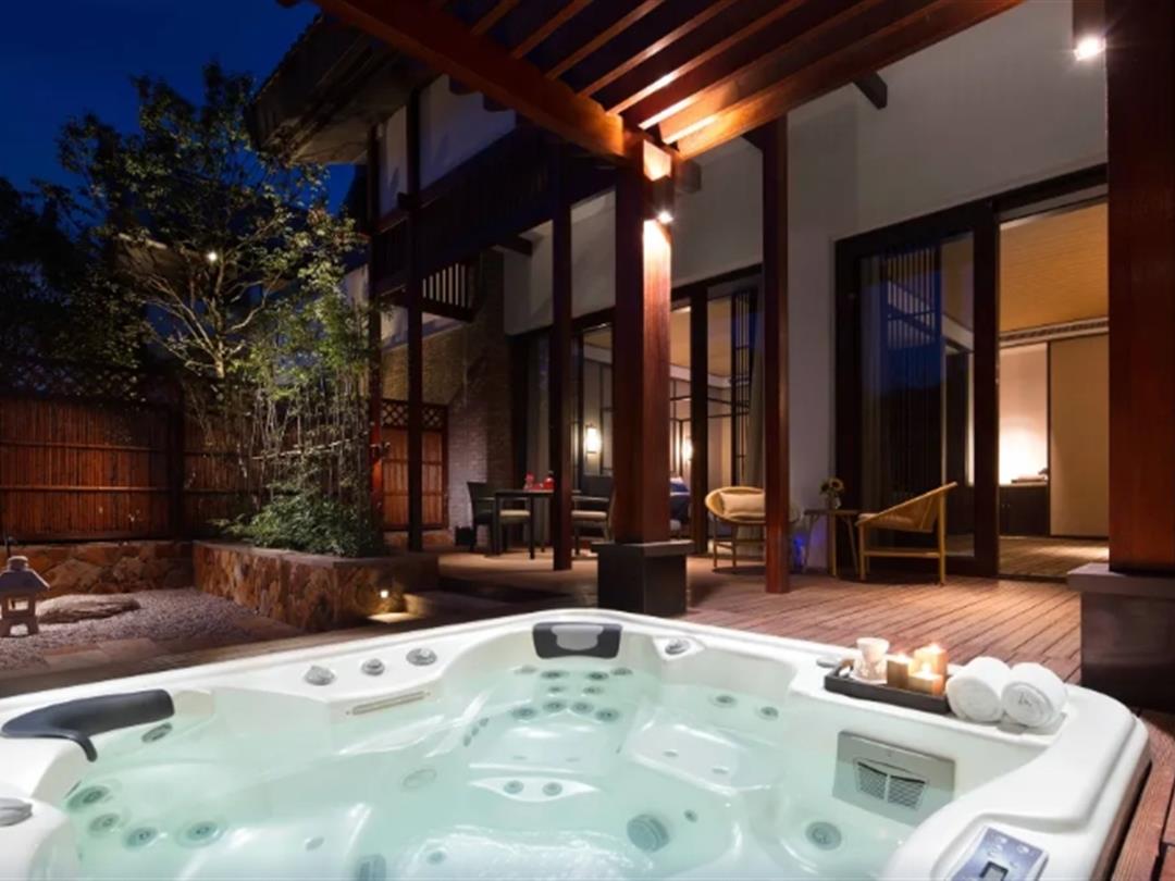 酒店设计了一座临湖室外泳池,盛夏季可以游泳、玩透明船、体验漂浮下午茶。再无法玩水的季节,泳池更是取景拍大片的好场地。同时,在这秘境山水之间,酒店还设计了冥想室与茶室——怡然居。一侧放置冥想垫,一侧摆放供可细品白茶的茶几,很安静,可以抄经书、做手工等。一座星空影音室,设有十个坐席,天花板采用了特殊星光设计,90度可折叠座椅让人舒适的躺着看电影。